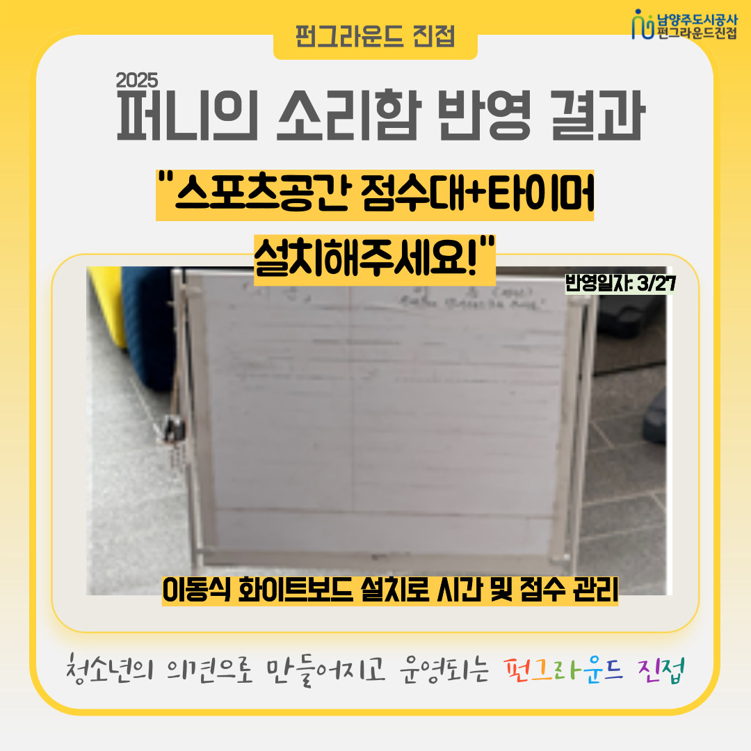 펀그라운드 진접을 이용하는 청소년들이 다양한 의견을 제시하고 공유할 수 있는 게시판입니다 (반영일: 2025.3.27.) 이동식 화이트보드 설치로 시간 및 점수 관리 작성자 펀그라운드진접 등록일자 2025년 7월 5일 18시 36분 44초 조회 73 033.jpg [ Size : 216.21KB, Down : 36 ] 미리보기 다운로드 답변하기 목록보기