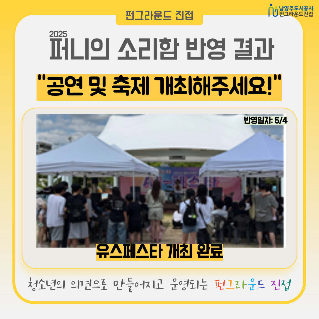 펀그라운드 진접을 이용하는 청소년들이 다양한 의견을 제시하고 공유할 수 있는 게시판입니다 (반영일: 2025.5.4.) 유스페스타 개최 완료 작성자 펀그라운드진접 등록일자 2025년 7월 5일 18시 22분 40초 조회 96 018.jpg [ Size : 235.81KB, Down : 33 ] 미리보기 다운로드 답변하기 목록보기