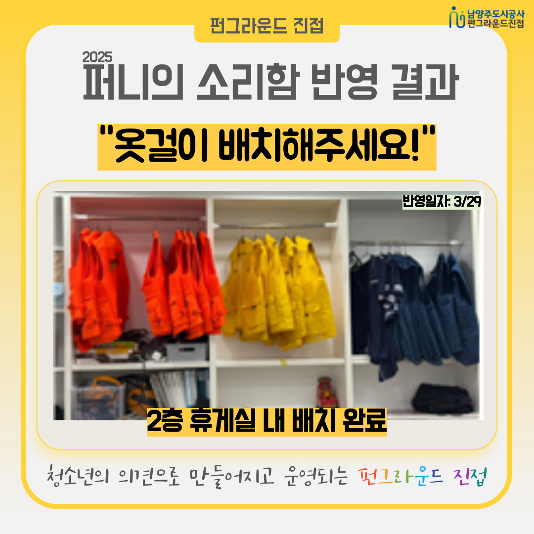 펀그라운드 진접을 이용하는 청소년들이 다양한 의견을 제시하고 공유할 수 있는 게시판입니다 (반영일: 2025.3.29.) 2층 휴게실 내 배치 완료 작성자 펀그라운드진접 등록일자 2025년 7월 5일 18시 38분 4초 조회 59 036.jpg [ Size : 239.95KB, Down : 20 ] 미리보기 다운로드 답변하기 목록보기
