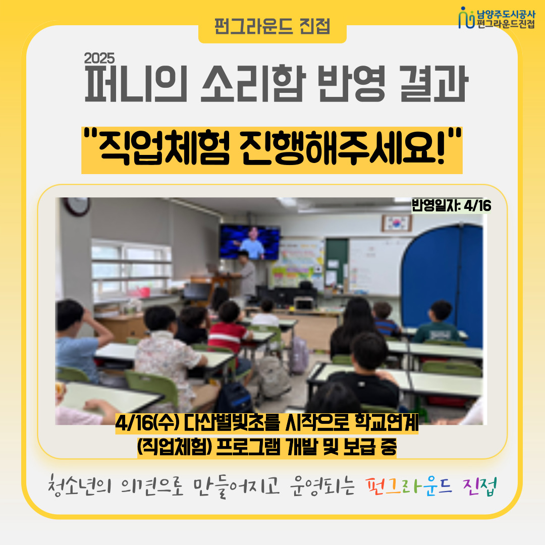 펀그라운드 진접을 이용하는 청소년들이 다양한 의견을 제시하고 공유할 수 있는 게시판입니다 (반영일: 2025.4.16.) 4/16(수) 다산별빛초를 시작으로 학교연계(직업체험) 프로그램 개발 및 보급 중 작성자 펀그라운드진접 등록일자 2025년 7월 5일 18시 33분 18초 조회 104 026.jpg [ Size : 264.2KB, Down : 37 ] 미리보기 다운로드 답변하기 목록보기
