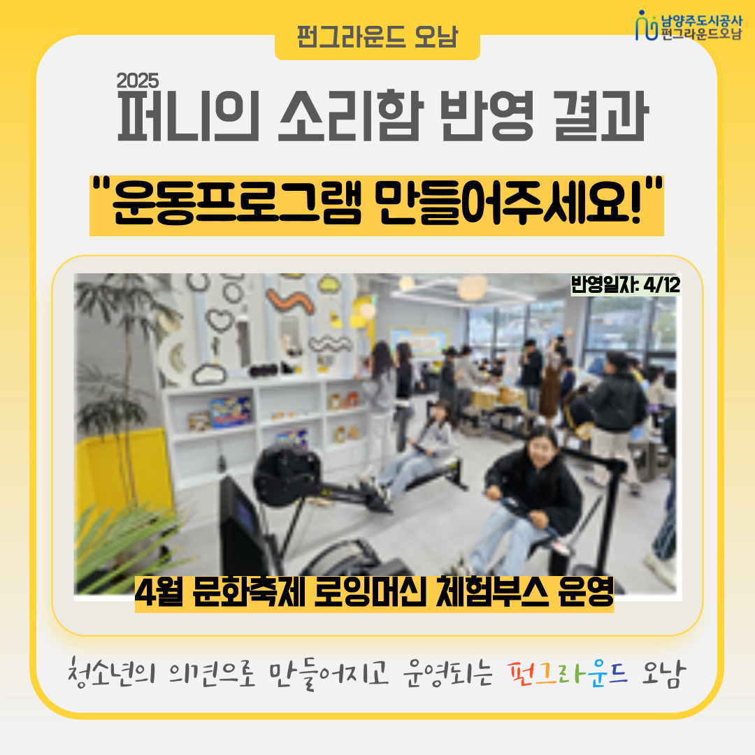 펀그라운드 진접을 이용하는 청소년들이 다양한 의견을 제시하고 공유할 수 있는 게시판입니다 (반영일: 2025.4.12.) 4월 문화축제 로잉머신 체험부스 운영 작성자 펀그라운드진접 등록일자 2025년 7월 5일 18시 53분 53초 조회 152 057.jpg [ Size : 258.58KB, Down : 74 ] 미리보기 다운로드 답변하기 목록보기