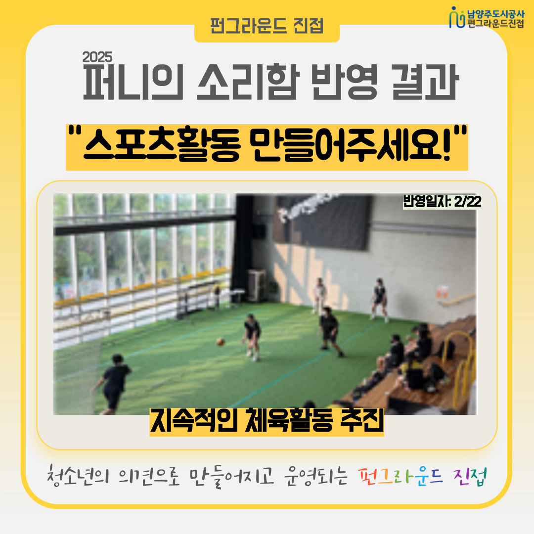 펀그라운드 진접을 이용하는 청소년들이 다양한 의견을 제시하고 공유할 수 있는 게시판입니다 (반영일: 2025.2.22.) 지속적인 체육활동 추진 작성자 펀그라운드진접 등록일자 2025년 7월 5일 18시 30분 11초 조회 83 021.jpg [ Size : 243.66KB, Down : 31 ] 미리보기 다운로드 답변하기 목록보기