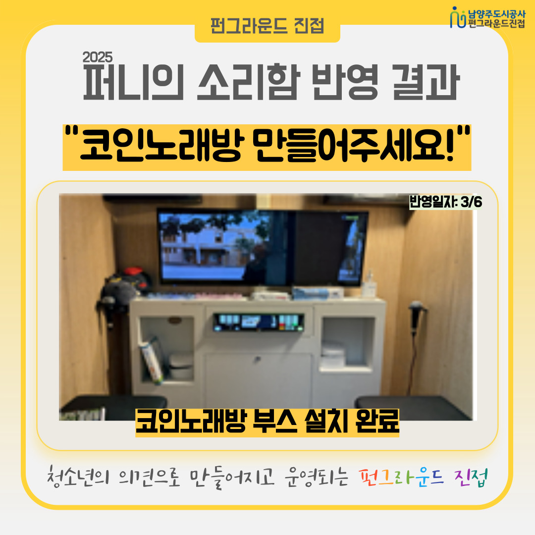 펀그라운드 진접을 이용하는 청소년들이 다양한 의견을 제시하고 공유할 수 있는 게시판입니다 (반영일: 2025.3.6.) 코인노래방 부스 설치 완료 작성자 펀그라운드진접 등록일자 2025년 7월 5일 18시 22분 2초 조회 84 017.jpg [ Size : 231.73KB, Down : 38 ] 미리보기 다운로드 답변하기 목록보기