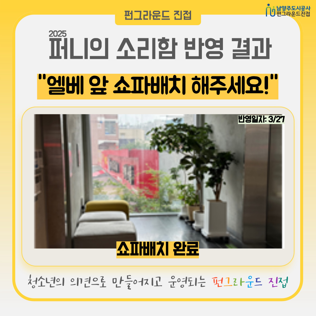 펀그라운드 진접을 이용하는 청소년들이 다양한 의견을 제시하고 공유할 수 있는 게시판입니다 (반영일: 2025.3.27.) 쇼파배치 완료 작성자 펀그라운드진접 등록일자 2025년 7월 5일 18시 37분 39초 조회 81 035.jpg [ Size : 228.01KB, Down : 30 ] 미리보기 다운로드 답변하기 목록보기