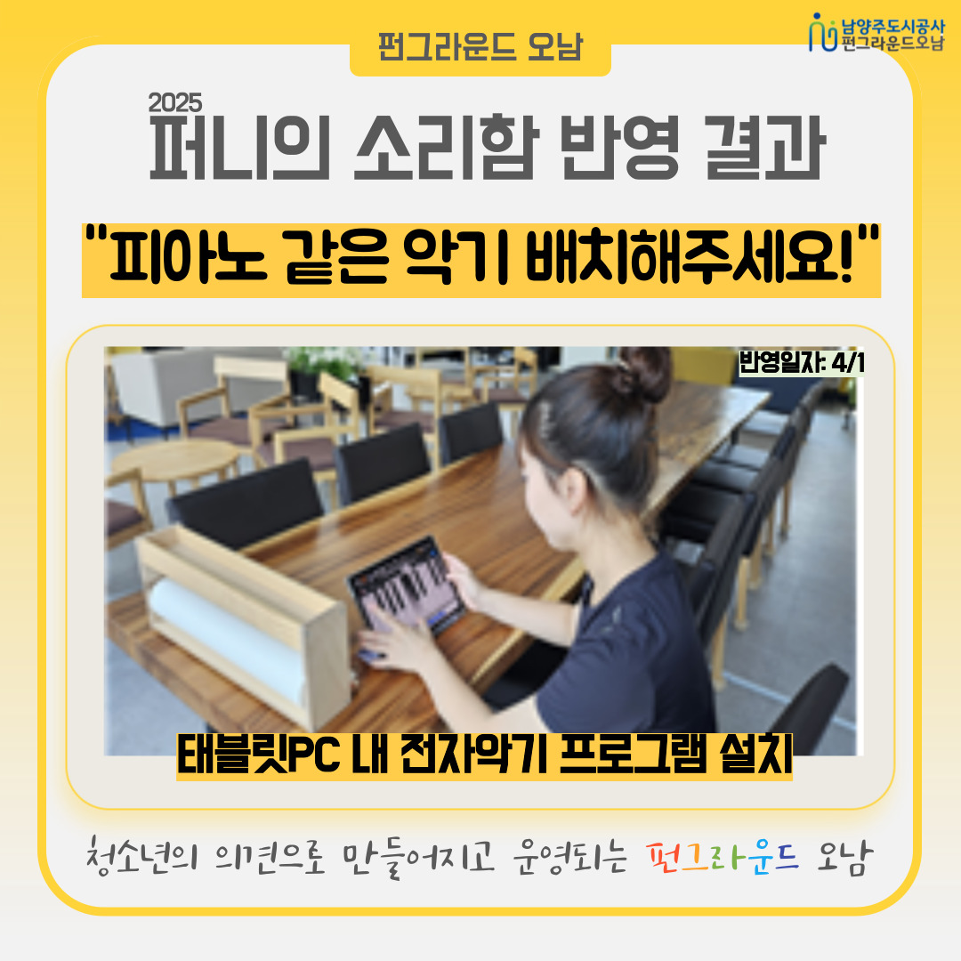 펀그라운드 진접을 이용하는 청소년들이 다양한 의견을 제시하고 공유할 수 있는 게시판입니다 (반영일: 2025.4.1.) 태블릿PC 내 전자악기 프로그램 설치 작성자 펀그라운드진접 등록일자 2025년 7월 5일 18시 52분 47초 조회 131 055.jpg [ Size : 251.9KB, Down : 49 ] 미리보기 다운로드 답변하기 목록보기