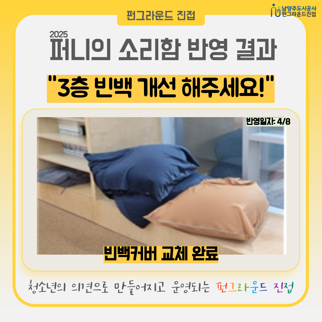 펀그라운드 진접을 이용하는 청소년들이 다양한 의견을 제시하고 공유할 수 있는 게시판입니다 (반영일: 2025.4.8.) 빈백커버 교체 완료 작성자 펀그라운드진접 등록일자 2025년 7월 5일 18시 35분 23초 조회 75 030.jpg [ Size : 212.43KB, Down : 31 ] 미리보기 다운로드 답변하기 목록보기
