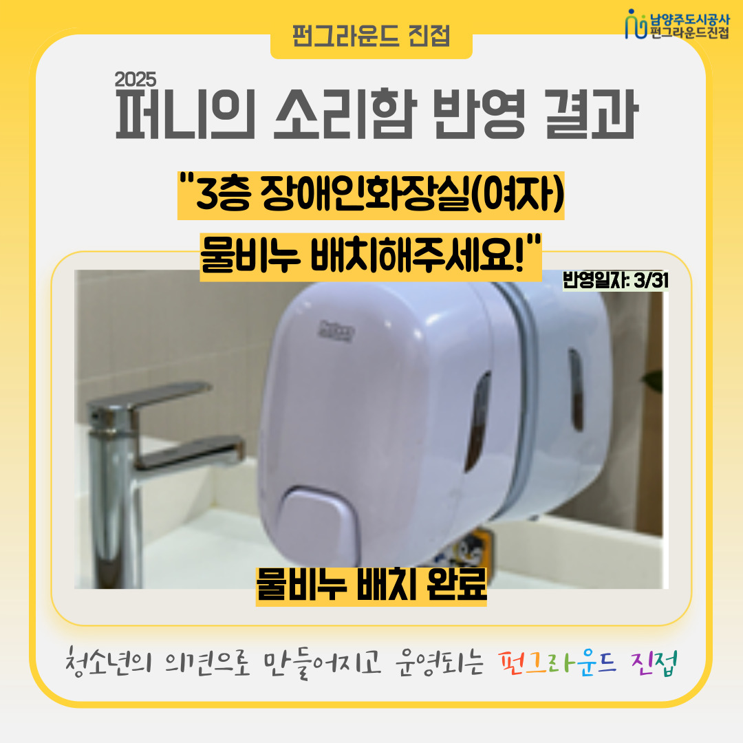 펀그라운드 진접을 이용하는 청소년들이 다양한 의견을 제시하고 공유할 수 있는 게시판입니다 (반영일: 2025.3.31.) 물비누 배치 완료 작성자 펀그라운드진접 등록일자 2025년 7월 5일 18시 39분 28초 조회 144 039.jpg [ Size : 210.14KB, Down : 43 ] 미리보기 다운로드 답변하기 목록보기