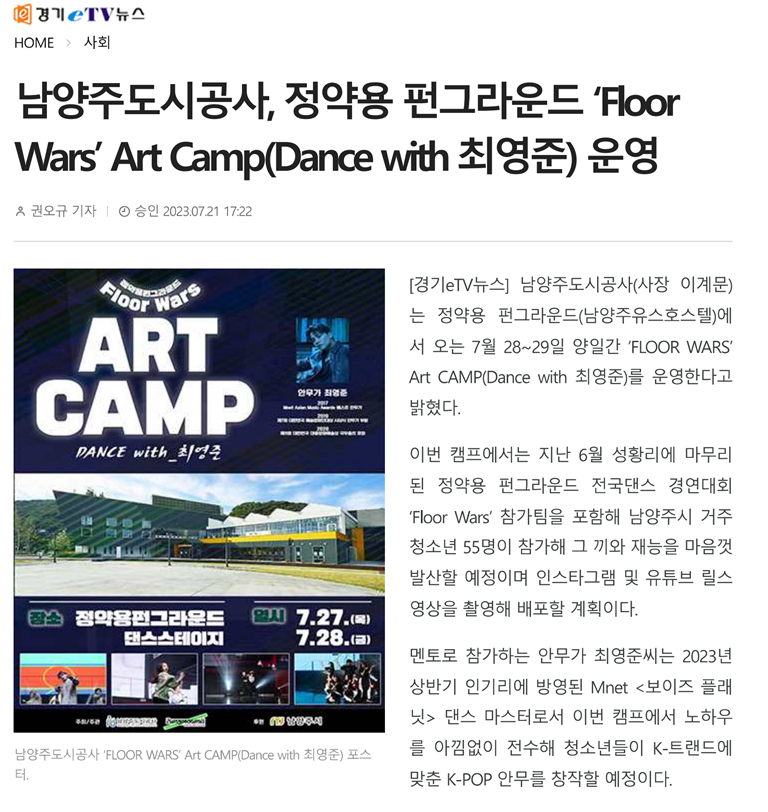 <전문바로가기:남양주도시공사, 정약용 펀그라운드 ‘Floor Wars’ Art Camp(Dance with 최영준) 운영 < 사회 < 기사본문 - 경기eTV뉴스 (ggetv.co.kr)