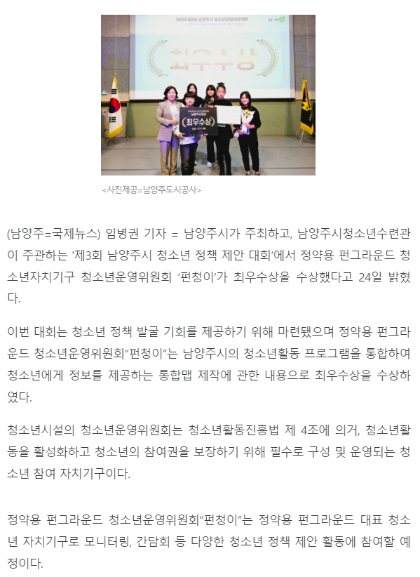 정약용 (2023. 10.) 정약용 펀그라운드, 2023년 제3회 청소년정책제안대회 남양주시장상 최우수상 수상 작성자 펀그라운드정약용 등록일자 2023년 10월 24일 16시 41분 26초 조회 343 <전문바로가기: https://www.gukjenews.com/news/articleView.html?idxno=2837911> <관련보도>남양주시 정약용 펀그라운드 청소년운영위원회 '펀청이'최우수상 수상정약용펀그라운드'펀청이', 제3회 청소년정책제안대회 최우수상 수상 스크린샷 2023-10-24 163735.png [ Size : 196.97KB, Down : 195 ] 미리보기 다운로드 목록보기