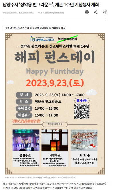 제목: 정약용 펀그라운드 청소년페스티벌 개관 1주년‘Happy Funthday’운영 < 남양주시 < 경기도 < 기사본문 - 경기&뉴스 (ggnnews.com)