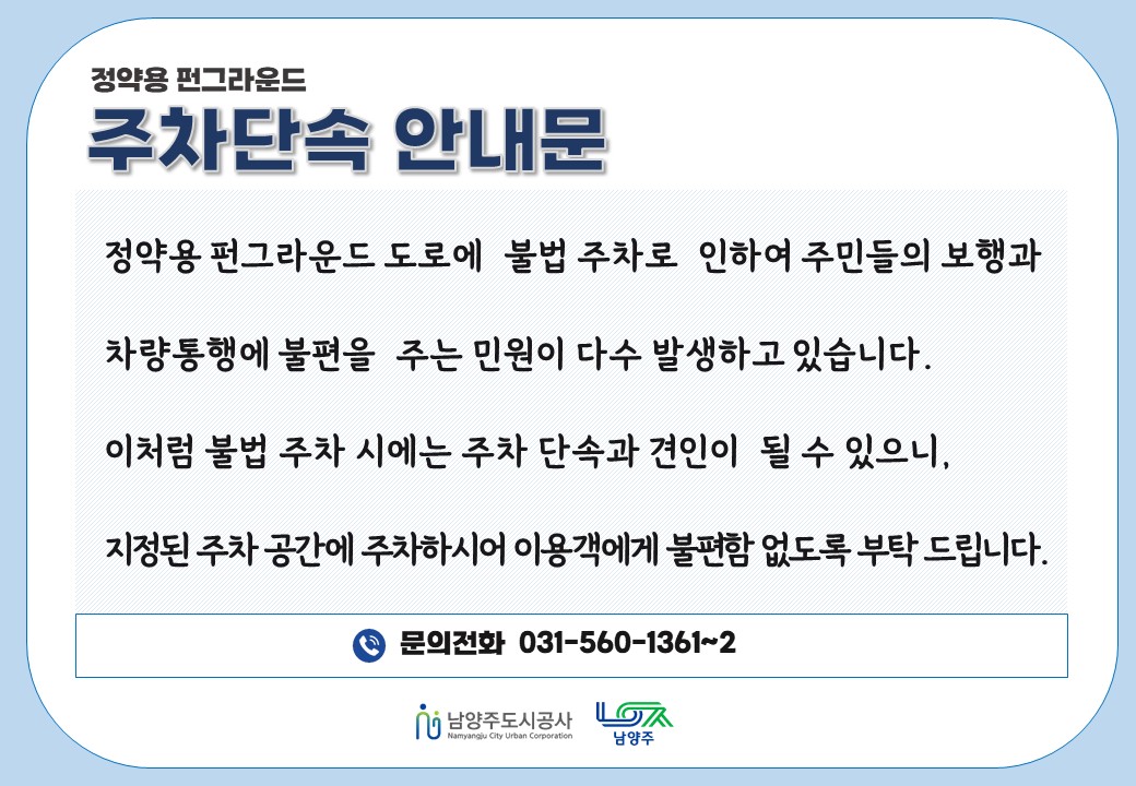 정약용 [공지] 정약용 펀그라운드 주차단속 안내 작성자 펀그라운드정약용 등록일자 2023년 10월 6일 16시 36분 16초 조회 772 3. 디자인 시안_가로형.jpg [ Size : 194.34KB, Down : 697 ] 미리보기 다운로드 목록보기