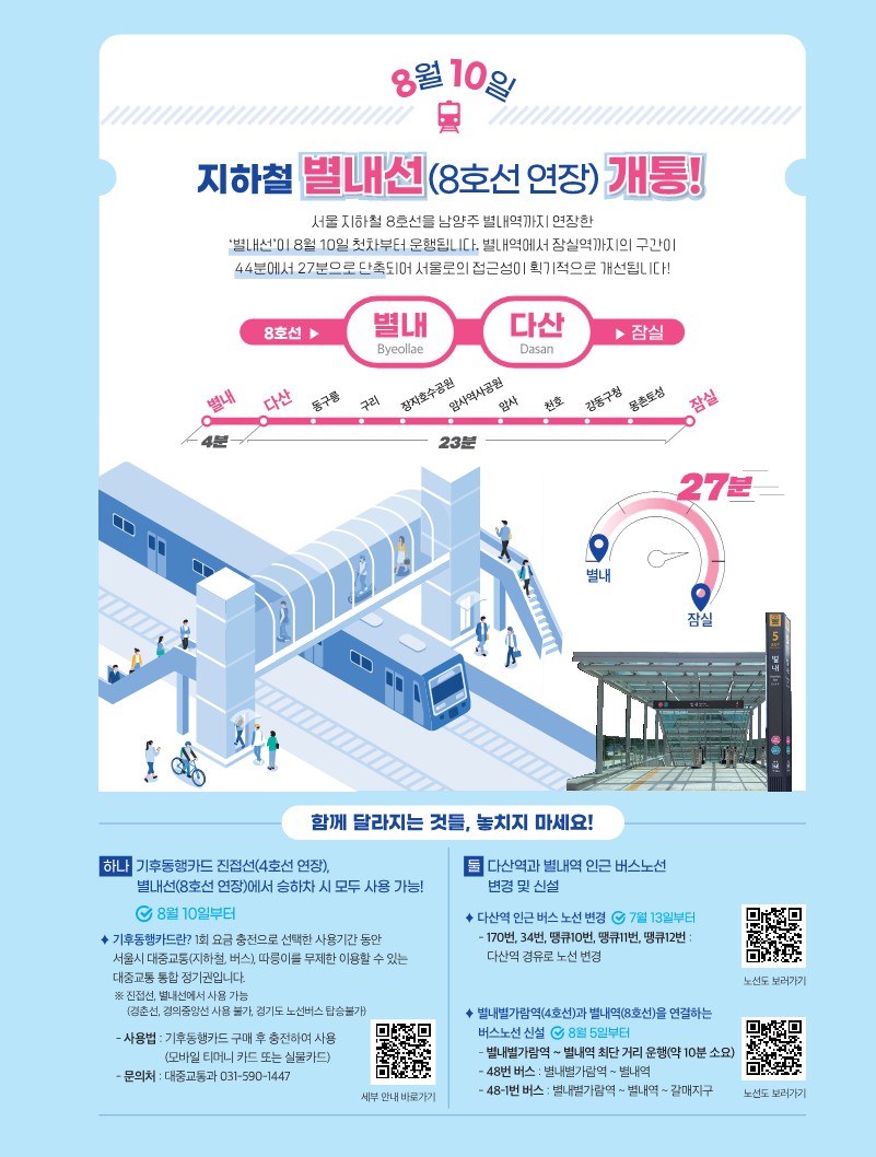 정약용 지하철 별내선(8호선 연장) 개통 안내(8월 10일) 작성자 펀그라운드정약용 등록일자 2024년 8월 1일 17시 18분 27초 조회 375 (별내선 개통)포스터 시안-복사_1.jpg [ Size : 169.48KB, Down : 206 ] 미리보기 다운로드 목록보기