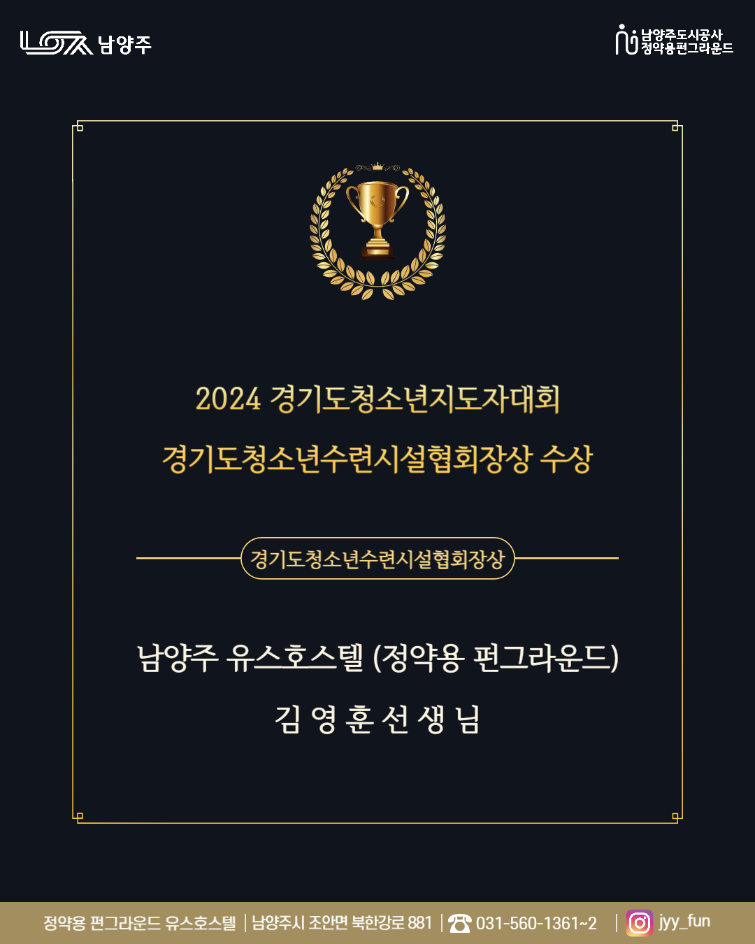정약용 2024 경기도청소년지도자대회 경기도청소년수련시설협회장상 수상 작성자 펀그라운드정약용 등록일자 2024년 10월 25일 14시 55분 58초 조회 327 카드뉴스(세로비율)-경기도청소년수련시설협회장상.jpg [ Size : 351.58KB, Down : 99 ] 미리보기 다운로드 목록보기