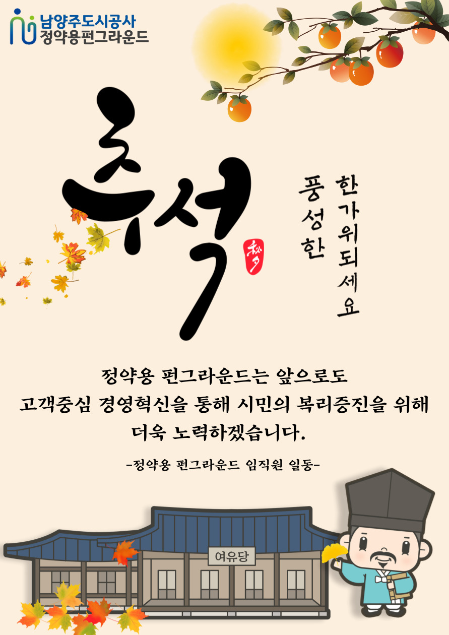 정약용 풍요로운 한가위 보내시길 바랍니다 작성자 펀그라운드정약용 등록일자 2025년 9월 26일 10시 56분 36초 조회 154 정약용 펀그라운드는 청소년과 시민의 복지 증진을 위해 더욱 노력하겠습니다.가을의 분위기를 느끼고 싶다면 정약용 펀그라운드로~!*정약용 펀그라운드는 연중무휴 운영합니다* 기획조정부에서-시킨-팝업-001.jpg [ Size : 211.2KB, Down : 71 ] 미리보기 다운로드 추석-001 (1).jpg [ Size : 250.82KB, Down : 41 ] 미리보기 다운로드 목록보기