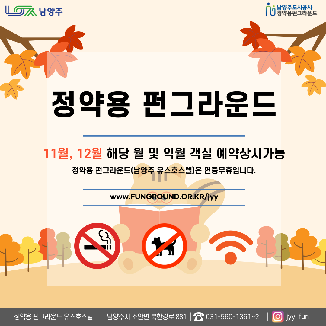 정약용 [공지] 11, 12월 정약용 펀그라운드 유스호스텔 객실 예약 안내 작성자 강정배 등록일자 2024년 11월 1일 18시 27분 58초 조회 349 11월 홈페이지.png [ Size : 204.24KB, Down : 137 ] 미리보기 다운로드 목록보기