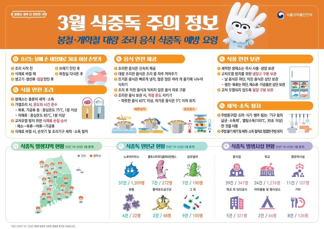 낮과 밤의 급격한 기온차로 인해 세균성 식중독 발생 우려가 높아 식품안전 조리 및 보관 등 식중독 예방, 관리에 각별한 주의가 필요합니다.