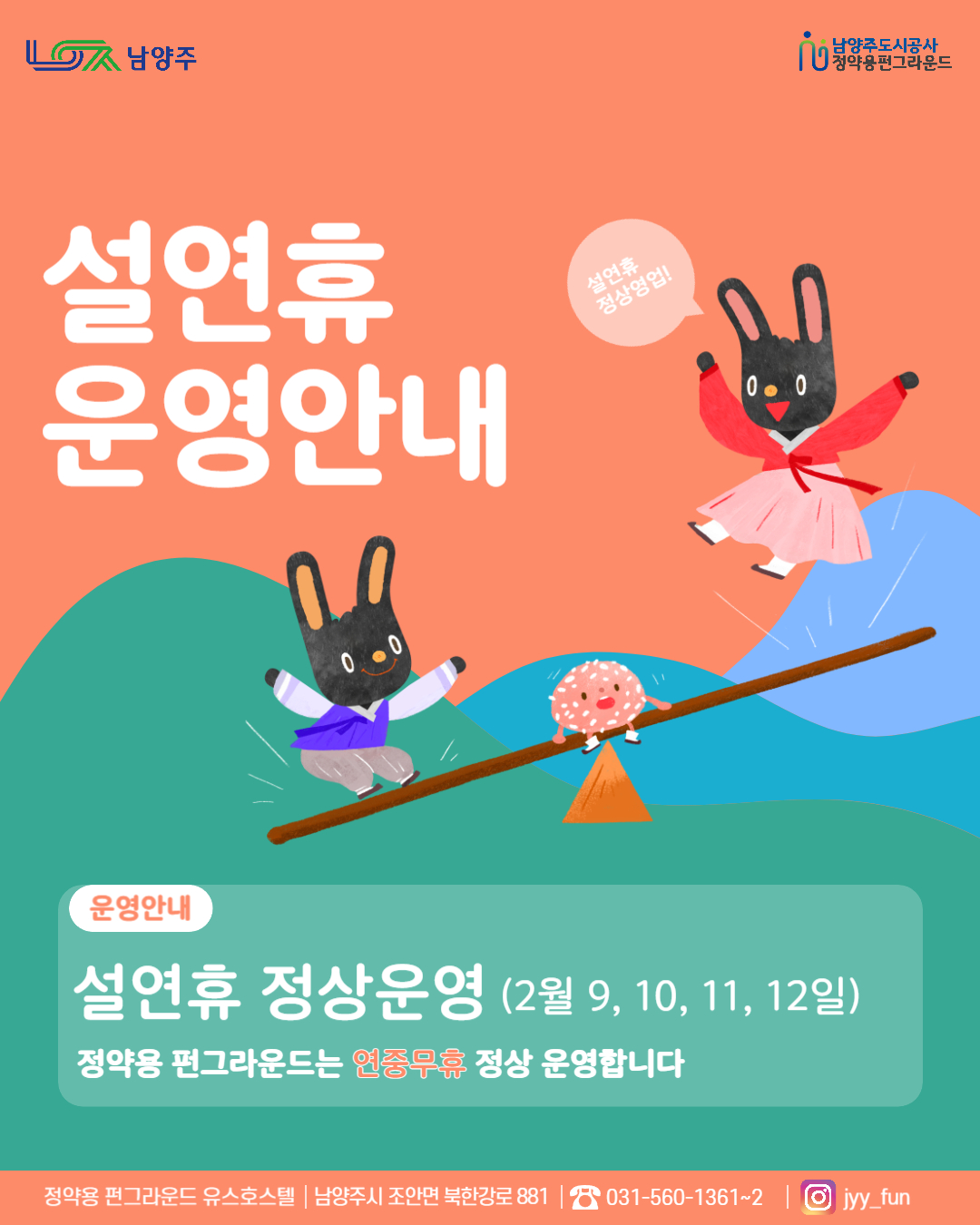 정약용 [공지] 정약용 펀그라운드 설연휴 정상 운영 안내 작성자 펀그라운드정약용 등록일자 2024년 2월 6일 16시 28분 54초 조회 392 카드뉴스(세로비율)-001 (2).jpg [ Size : 533.03KB, Down : 205 ] 미리보기 다운로드 목록보기
