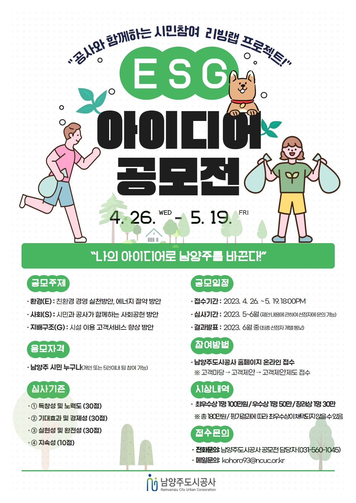 정약용 [남양주도시공사] 2023년 시민참여 ESG 아이디어 공모전 작성자 펀그라운드정약용 등록일자 2023년 4월 29일 22시 45분 50초 조회 469 ESG 아이디어 공모전.jpg [ Size : 760.61KB, Down : 239 ] 미리보기 다운로드 목록보기