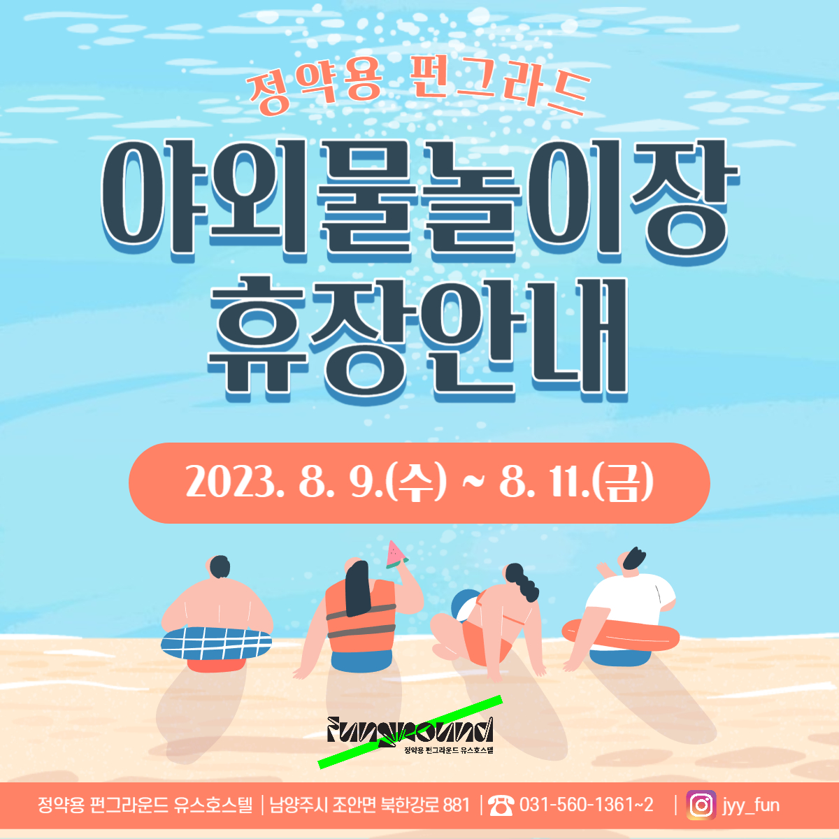 정약용 [공지] 정약용 펀그라운드 야외물놀이장 임시휴장(8.9.~8.11.) 안내 작성자 펀그라운드정약용 등록일자 2023년 8월 9일 12시 52분 33초 조회 490 제6호 태풍 '카눈' 북상에 따라야외물놀이장을 임시 휴장합니다이용객의 안전을 위한 조치이오니너그러운 마음으로 양해 부탁드립니다휴장기간 : 2023. 8. 9.(수) ~ 8. 11.(금)※기상 상황에 따라 휴장 연장될 수 있음 야외물놀이장 휴장안내.jpg [ Size : 811.94KB, Down : 263 ] 미리보기 다운로드 목록보기