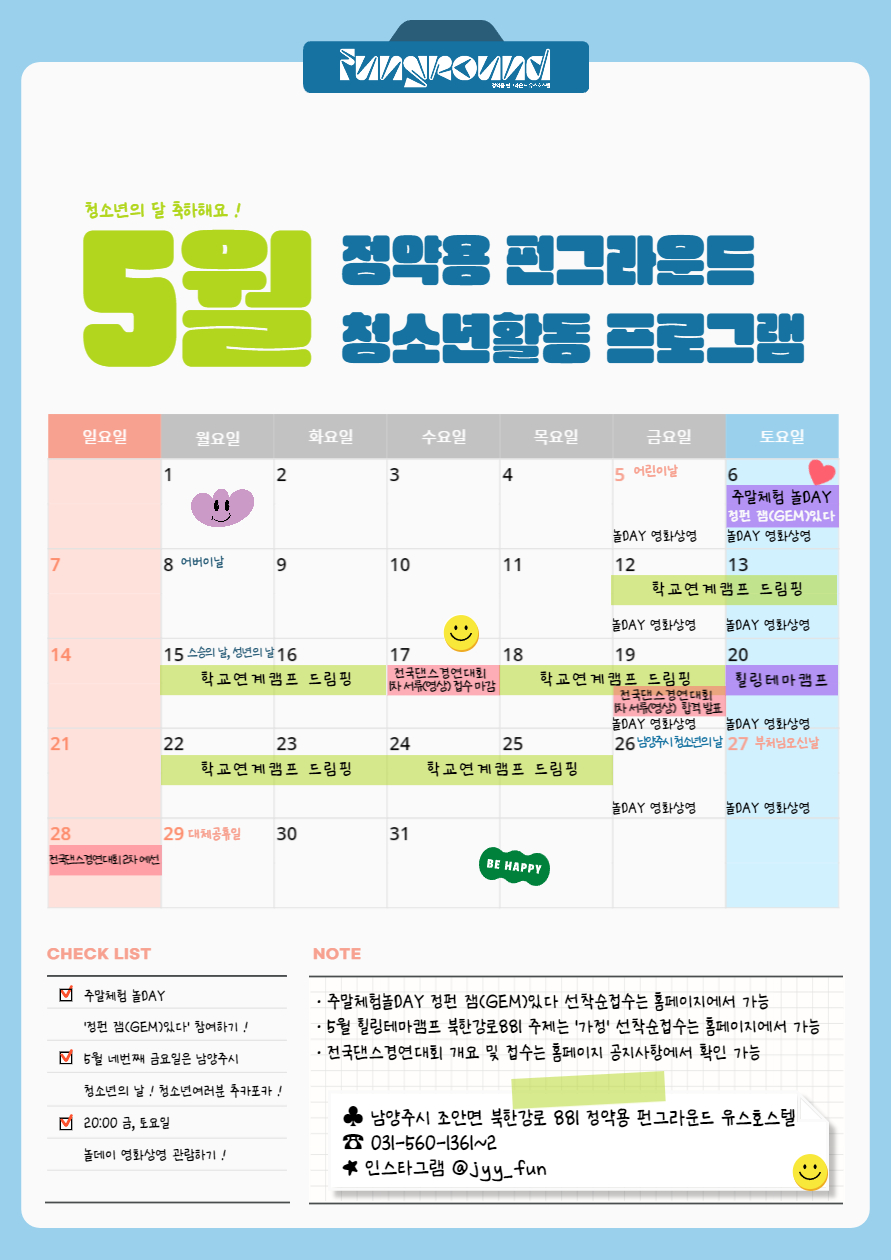 정약용 [공지] 5월 정약용 펀그라운드 청소년활동 프로그램 안내 작성자 펀그라운드정약용 등록일자 2023년 4월 29일 22시 50분 16초 조회 598 웹포스터_2023년 월간 일정 안내-001.jpg [ Size : 433.09KB, Down : 417 ] 미리보기 다운로드 목록보기