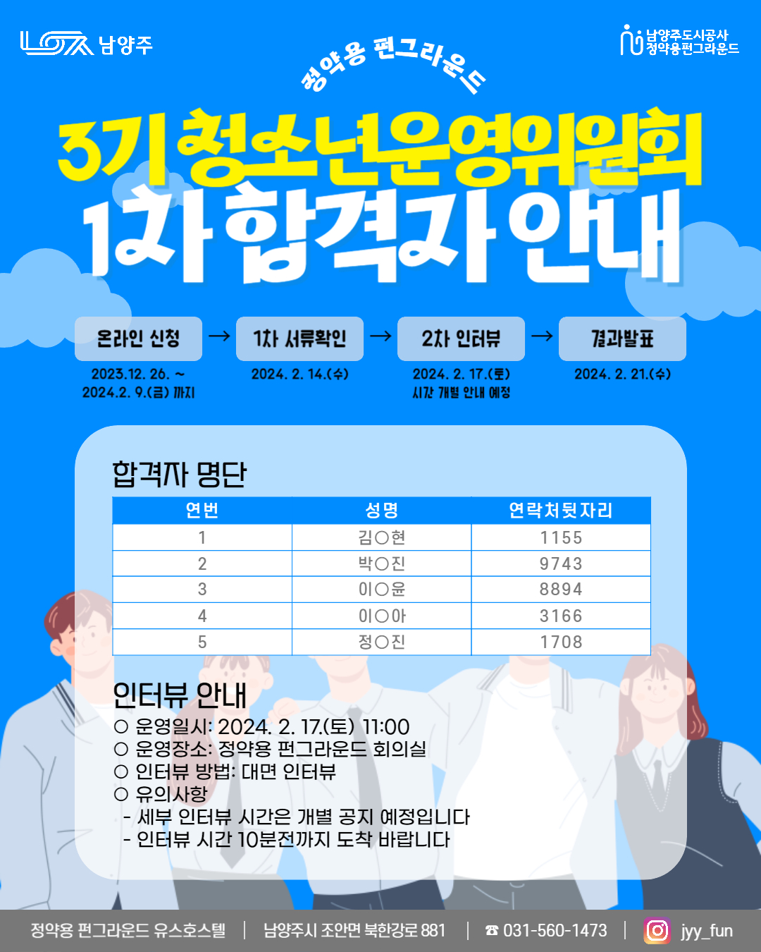 정약용 [청소년운영위원회] 3기 청소년운영위원회 1차 서류심사 합격자 안내 작성자 펀그라운드정약용 등록일자 2024년 2월 15일 8시 59분 41초 조회 328 청운위(세로비율)-001 (2).jpg [ Size : 675.95KB, Down : 120 ] 미리보기 다운로드 목록보기
