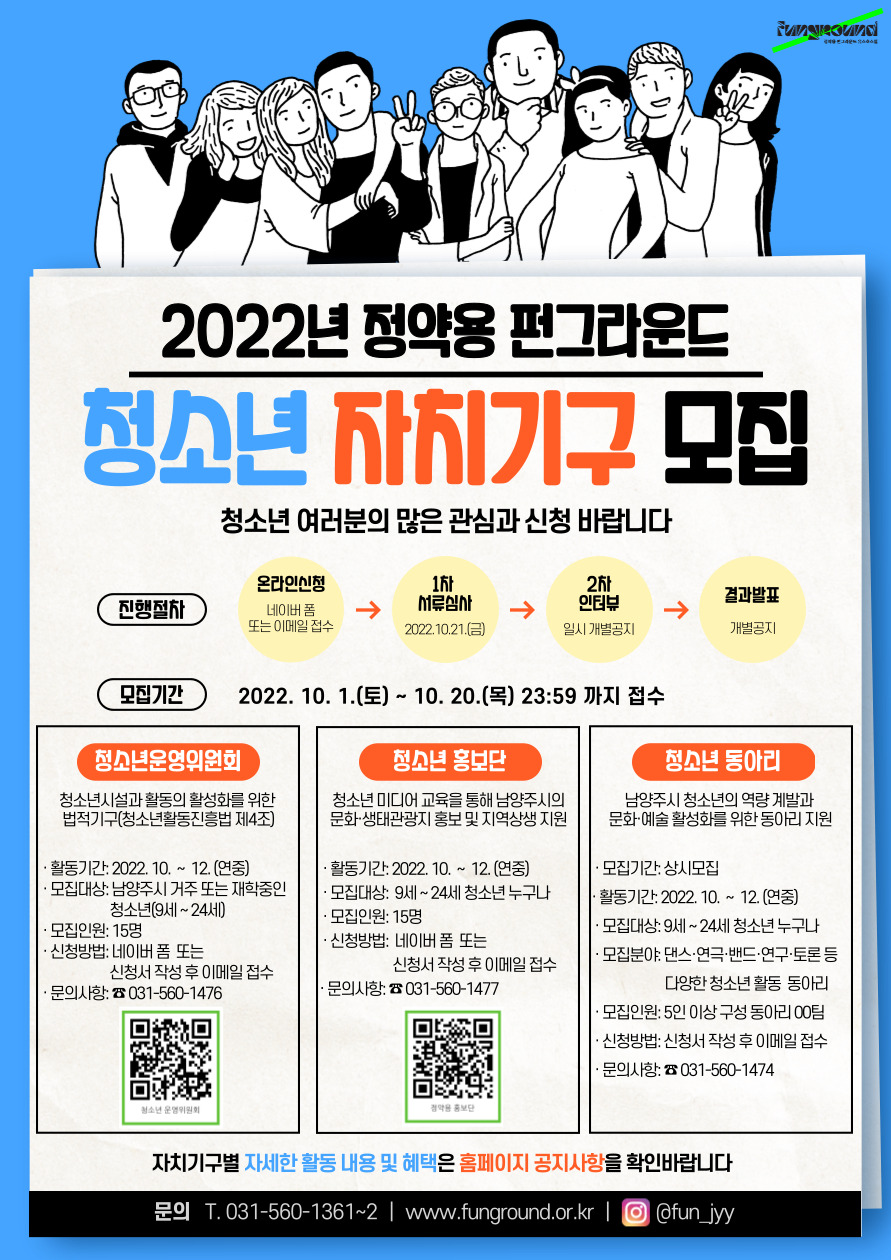 정약용 [모집]2022년 정약용 펀그라운드 청소년자치조직 모집 안내 작성자 펀그라운드정약용 등록일자 2022년 10월 1일 18시 49분 51초 조회 661 2022 정약용 펀그라운드 자치기구 모집 안내(jpg).jpg [ Size : 369.37KB, Down : 416 ] 미리보기 다운로드 목록보기