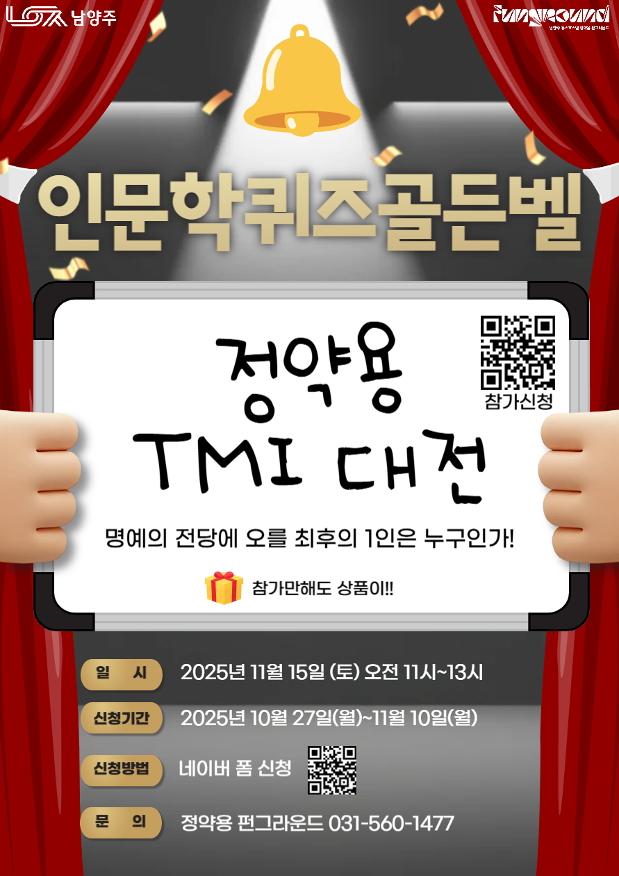 정약용 [정약용 아카데미] 독서축제 '북적북적', 청소년 골든벨 '정약용 TMI 대전' 참가자 모집 안내 및 예상문제 작성자 펀그라운드정약용 등록일자 2025년 11월 1일 11시 18분 0초 조회 223 골든벨 '정약용 TMI 대전' 참가 신청 바로가기독서축제 '북적북적' 도서 판매 접수 바로가기 독서축제-001.jpg [ Size : 499.9KB, Down : 47 ] 미리보기 다운로드 독서축제 북적북적.jpg [ Size : 311.62KB, Down : 37 ] 미리보기 다운로드 정약용 TMI 대전 예상문제 - 100문제.hwp [ Size : 224KB, Down : 234 ] 다운로드 목록보기