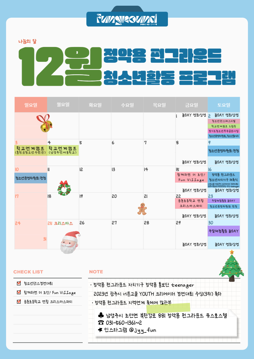 정약용 [공지] 12월 정약용 펀그라운드 청소년활동 프로그램 안내 작성자 펀그라운드정약용 등록일자 2023년 12월 1일 16시 21분 14초 조회 463 웹포스터_2023년 월간 일정 안내-001.jpg [ Size : 429.87KB, Down : 319 ] 미리보기 다운로드 목록보기