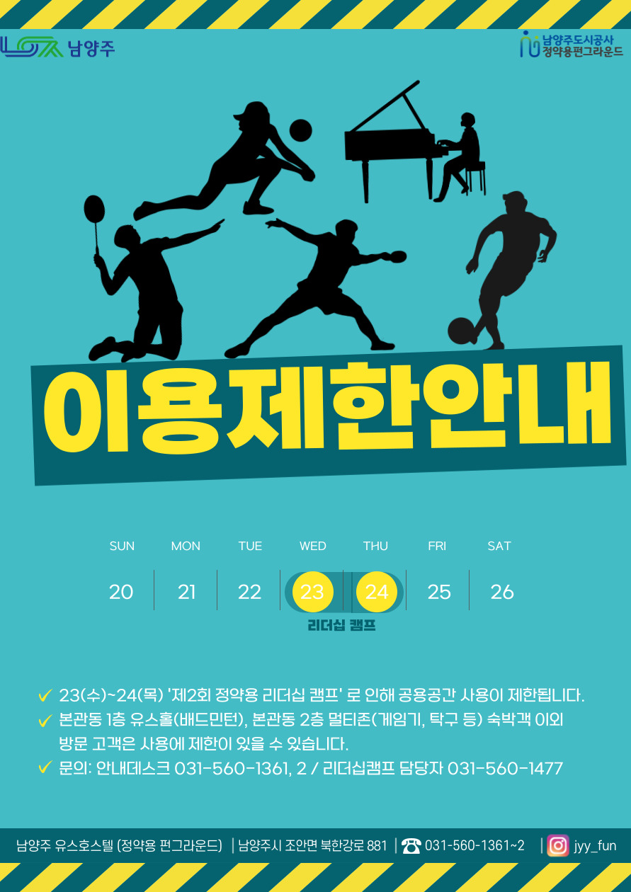 정약용 [이용제한안내] 7. 23.(수)~24.(목) 작성자 펀그라운드정약용 등록일자 2025년 7월 18일 9시 16분 35초 조회 225 정약용 펀그라운드 자체캠프 운영에 따라 공용공간 이용을 제한하오니,이용에 참고 부탁드립니다. 감사합니다. 이용제한안내-001.jpg [ Size : 245.7KB, Down : 96 ] 미리보기 다운로드 목록보기