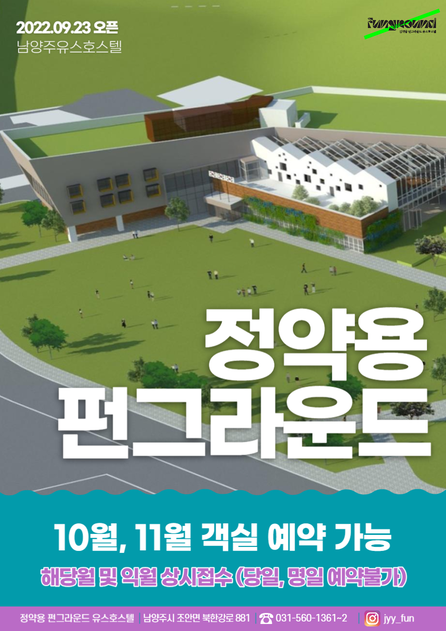정약용 [공지] 10, 11월 정약용 펀그라운드 유스호스텔 객실 예약 안내 작성자 펀그라운드정약용 등록일자 2023년 9월 27일 15시 32분 56초 조회 569 정약용 펀그라운드 (남양주 유스호스텔) 10월, 11월 객실 예약 안내 10. 1.(월) 부터 가능* 객실 예약기간: 해당 월 및 익월 상시접수(당일, 명일 예약 불가)※정약용 펀그라운드(남양주 유스호스텔)은 연중무휴 24시 운영입니다※ 웹포스터_공지사항-001.jpg [ Size : 666.17KB, Down : 394 ] 미리보기 다운로드 목록보기