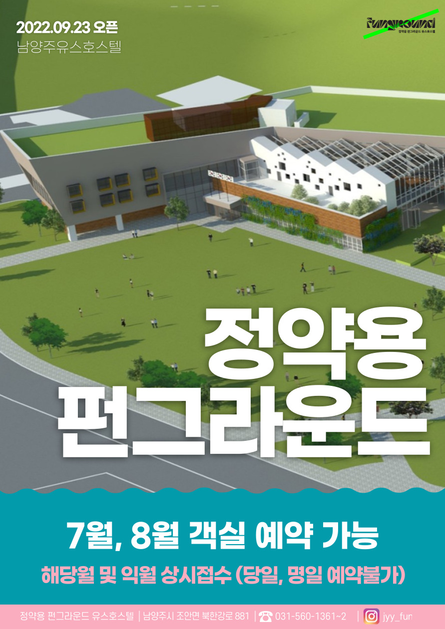 정약용 [예약] 7, 8월 정약용 펀그라운드 유스호스텔 객실 예약 가능 안내 작성자 펀그라운드정약용 등록일자 2023년 7월 4일 11시 16분 5초 조회 519 정약용 펀그라운드 (남양주 유스호스텔) 7월, 8월 객실 예약 안내 7. 1.(토) 부터 가능* 객실 예약기간: 해당 월 및 익월 상시접수(당일, 명일 예약 불가)※정약용 펀그라운드(남양주 유스호스텔)은 연중무휴 24시 운영입니다※ 웹포스터_공지사항-001 (1).jpg [ Size : 259.39KB, Down : 310 ] 미리보기 다운로드 목록보기