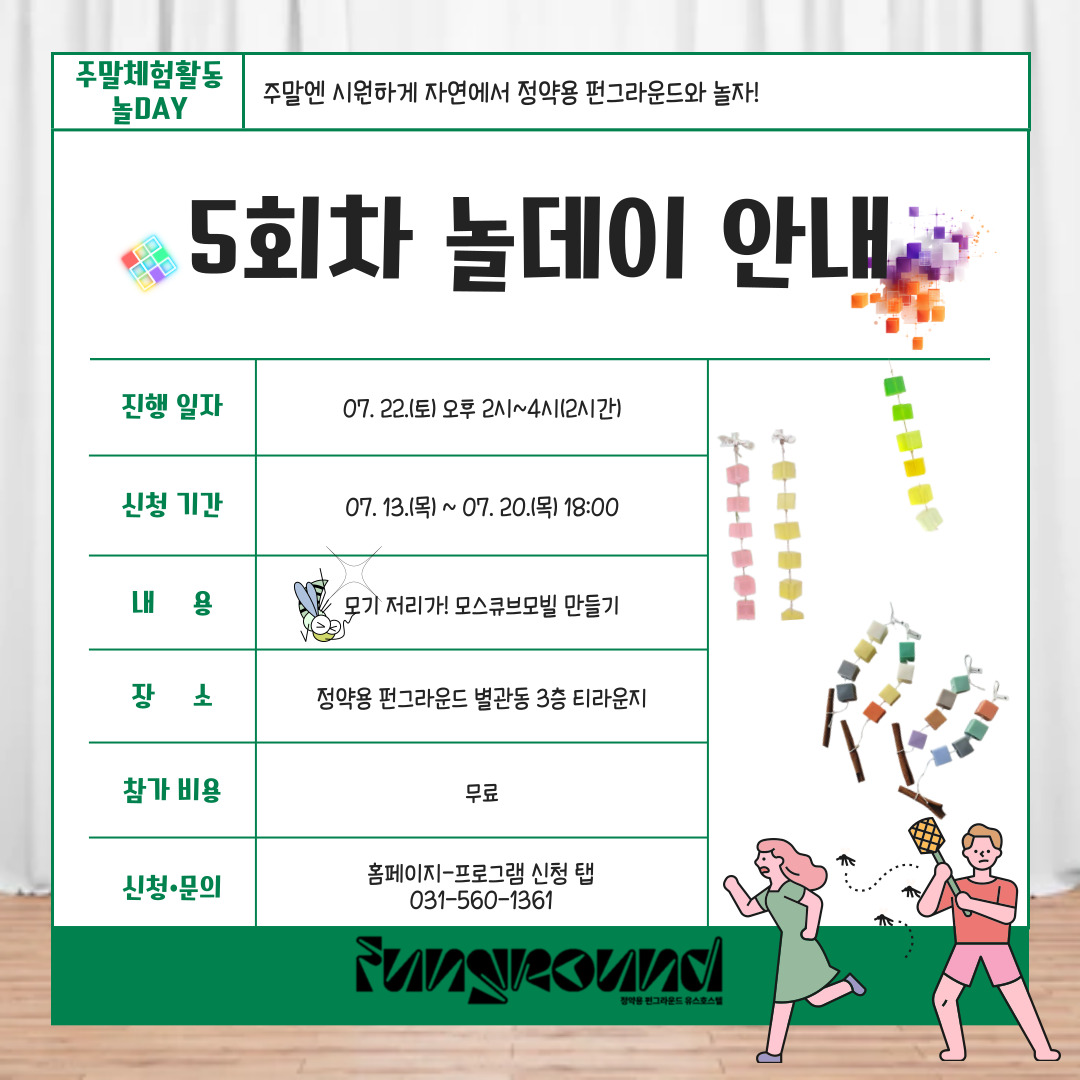 | 수업 내용 | [2023 정약용 펀그라운드 5회차 주말체험프로그램 놀DAY] 모스큐브모빌 만들기 1. 일 시: 7. 22.(토) 14:00~17:00 2. 접수기간: 7. 13.(목) ~ 7. 20.(목) 18:00 까지 3. 활동내용: 모스큐브모빌 만들기 체험 4. 활동장소: 정약용 펀그라운드 별관동 3층 티라운지(남양주시 조안면 북한강로 881) 5. 참 가 비: 무료 6. 대 상: 남양주시 초등-중등 청소년(만9세~만16세) 7.문 의: 031-560-1361 *당일취소 경우 다음 회기 주말체험활동 참여가 어려울 수 있습니다* |