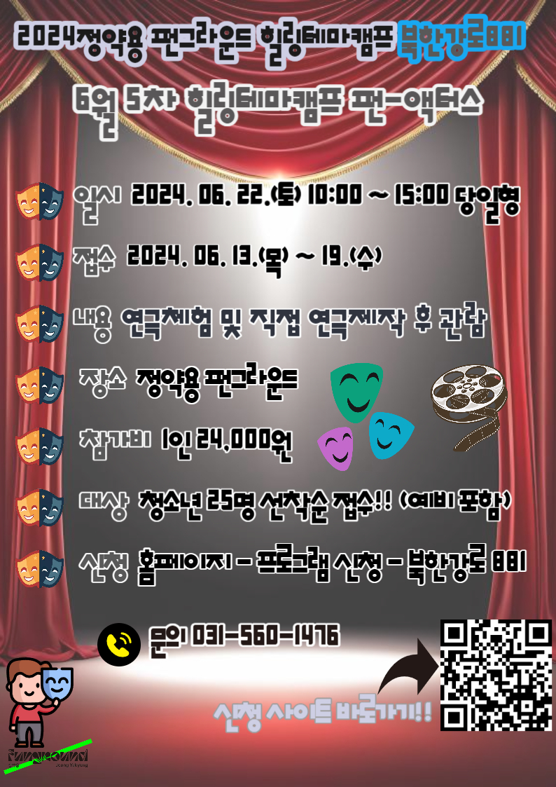 | 수업 내용 | 정약용 펀그라운드 제5회차(6월) 힐링테마캠프 북한강로 881 "펀-액터스" 1. 일 시: 6. 22(토) 10:00 ~ 14:30 2. 접수기간: 6. 13.(월) ~ 6. 19.(수). 23시까지 3. 대상인원: 청소년 25명 선착순 모집 (예비 50번까지 접수) 4. 캠프주제: 뮤지컬체험(관람 포함)을 주제로 캠프 5. 활동내용: 뮤지컬 배우 체험 및 직접 뮤지컬 제작 후 무대소품을 활용한 공연 6. 활동장소: 정약용 펀그라운드 (남양주시 조안면 북한강로 881) 7. 참 가 비: 24,000원(식비 포함) 8.문 의: 031-560-1476 ※ 참가비 입금 안내 : 11. 13.(수) 18:00 이후 입금시간 및 안내사항 단체문자 발송 ※ 입금 기한을 지켜주시기 바라며, 입금기한 경과 시 대기자에게 참여 양도 ※ 참가자 단체 문자 발송관련 하여 도착하지 않았을시 스팸문자함 확인 ※ 신청자 정보는 청소년 계정으로 신청 |