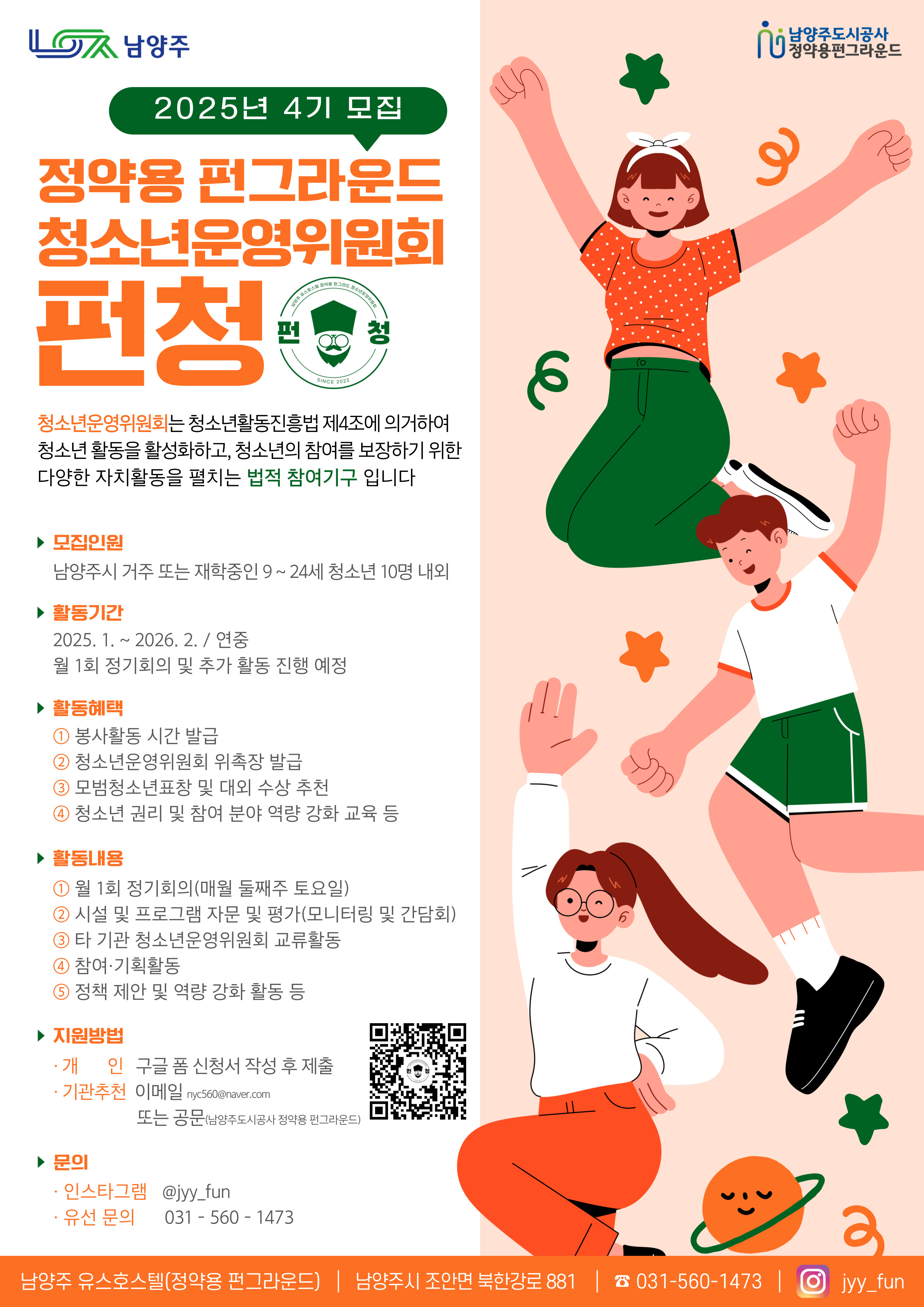 청소년운영위원회 2025년 4기 정약용 펀그라운드 청소년운영위원회 펀청 모집 안내 작성자 펀그라운드정약용 등록일자 2024년 12월 5일 8시 53분 12초 조회 180 4기 청소년운영위원회 모집 안내문.jpg [ Size : 1.2MB, Down : 86 ] 미리보기 다운로드 목록보기
