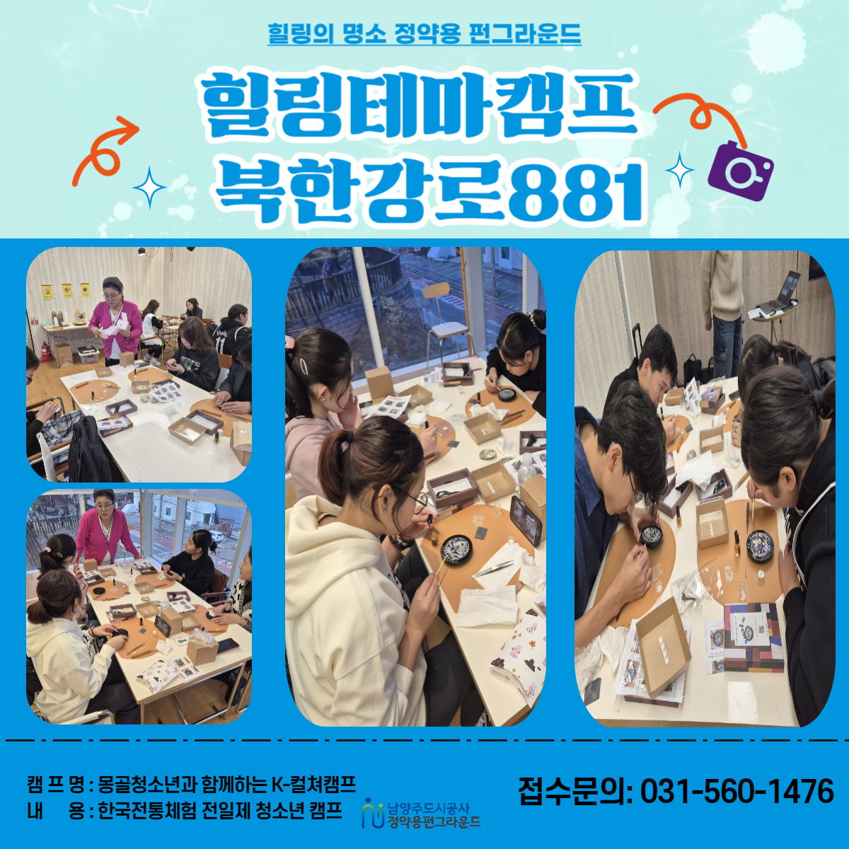 힐링테마캠프 북한강로881 8회차 힐링테마캠프 북한강로881 [몽골청소년과 함께하는 K-컬쳐캠프] 작성자 펀그라운드정약용 등록일자 2024년 11월 30일 10시 57분 18초 조회 184 몽골청소년과 함께 하는 K-컬쳐캠프.png [ Size : 1.63MB, Down : 92 ] 미리보기 다운로드 목록보기