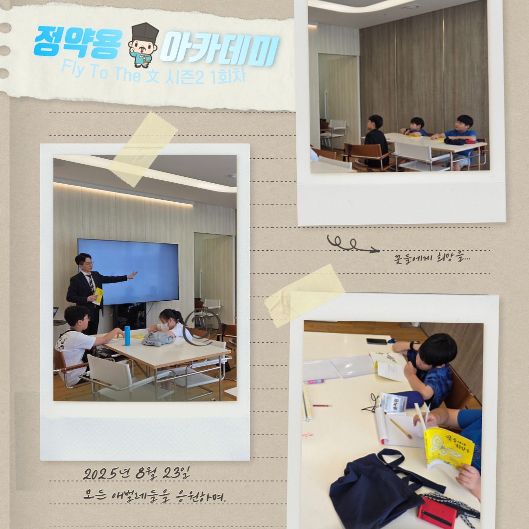 청소년 페스티벌 2025 정약용 아카데미 시즌2 인문학탐구1 작성자 펀그라운드정약용 등록일자 2025년 9월 10일 15시 37분 13초 조회 54 정약용 아카데미 시즌2인문학탐구 1회차!정약용 초서독서법과 함께하는 인문학탐구!10대 20대 30대 40대 50대에도 다르게 읽히는 명작, '꽃들에게 희망을' 을 읽으며,원고지 작성법, 글짓기를 함께 해보는 시간 -8월 30일에는 운율을 배워보며 자연을 벗삼아 시를 지어보자! 아카데미-후기-005.jpg [ Size : 293.31KB, Down : 39 ] 미리보기 다운로드 목록보기