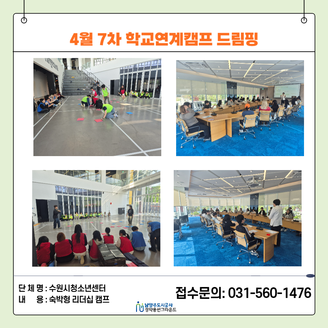 학교연계캠프 드림핑 정약용 펀그라운드 학교연계캠프 드림핑(수원시청소년센터) 작성자 펀그라운드정약용 등록일자 2024년 10월 5일 11시 3분 42초 조회 108 7차 수원시청소년센터.png [ Size : 1.17MB, Down : 48 ] 미리보기 다운로드 목록보기