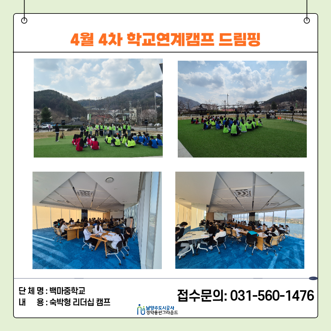 학교연계캠프 드림핑 정약용 펀그라운드 학교연계캠프 드림핑 (백마중학교) 작성자 펀그라운드정약용 등록일자 2024년 10월 5일 11시 2분 11초 조회 122 4차 백마중.png [ Size : 1.12MB, Down : 52 ] 미리보기 다운로드 목록보기