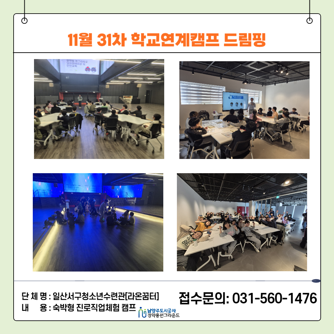 학교연계캠프 드림핑 11월31차 학교연계캠프 드림핑(일산서구청소년수련관'라온꿈터') 작성자 펀그라운드정약용 등록일자 2024년 11월 30일 10시 52분 46초 조회 150 일산서구청소년수련관 캠프.png [ Size : 1.1MB, Down : 66 ] 미리보기 다운로드 목록보기