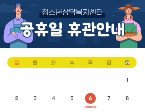 상담복지센터 2024년 6월 휴관일 안내 작성자 청소년상담복지센터 등록일자 2024년 5월 23일 16시 1분 17초 조회 311 공휴일 휴관안내(2024년 6월).png [ Size : 55.64KB, Down : 151 ] 미리보기 다운로드 목록보기