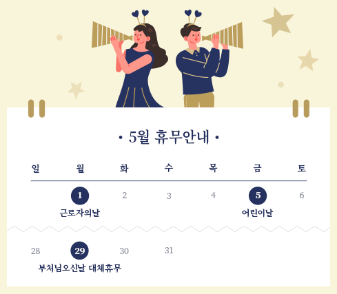 상담복지센터 5월 휴관일 안내 작성자 청소년상담복지센터 등록일자 2023년 4월 24일 19시 48분 34초 조회 379 5월 휴무안내.PNG [ Size : 27.6KB, Down : 185 ] 미리보기 다운로드 목록보기