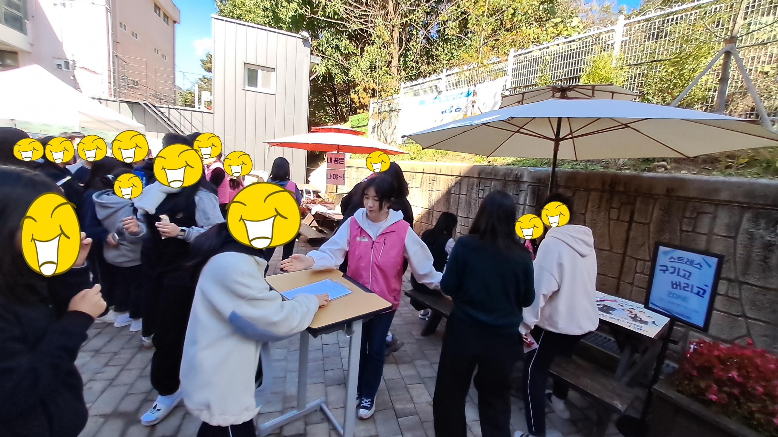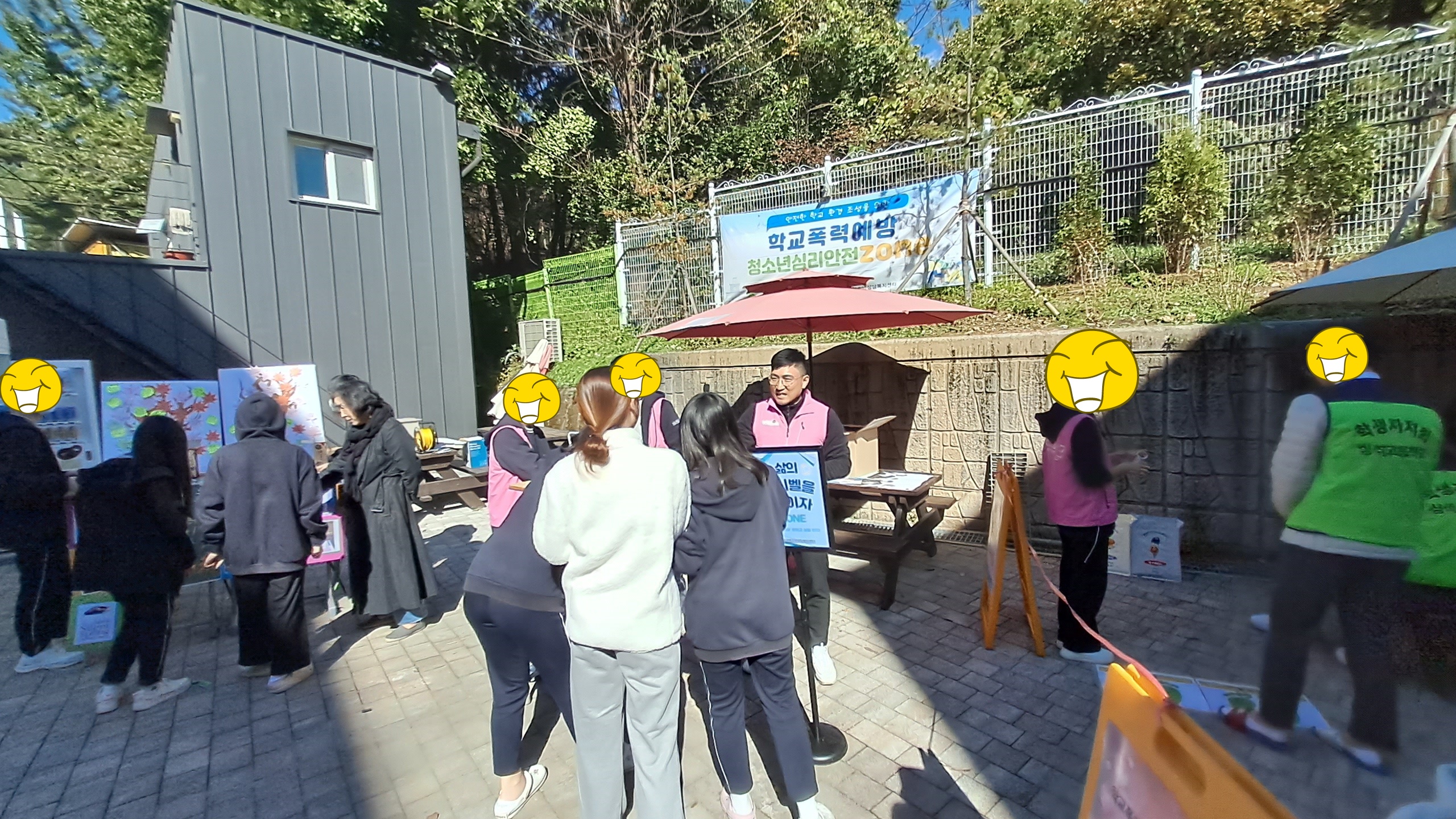 등교맞이 인사, 학교폭력예방 캠페인의 등굣길 행사가 이루어졌으며 매점 앞 공터에서는 스트레스 구기고버리고, 삶의 데시벨을 높이자, 드루와 손가락 오락실 등 3가지 부스를 참여한 학생들에게는 몸과 마음을 챙길 수 있는 힐링 간식꾸러미를 나누어주는 활동을 진행하였습니다.
