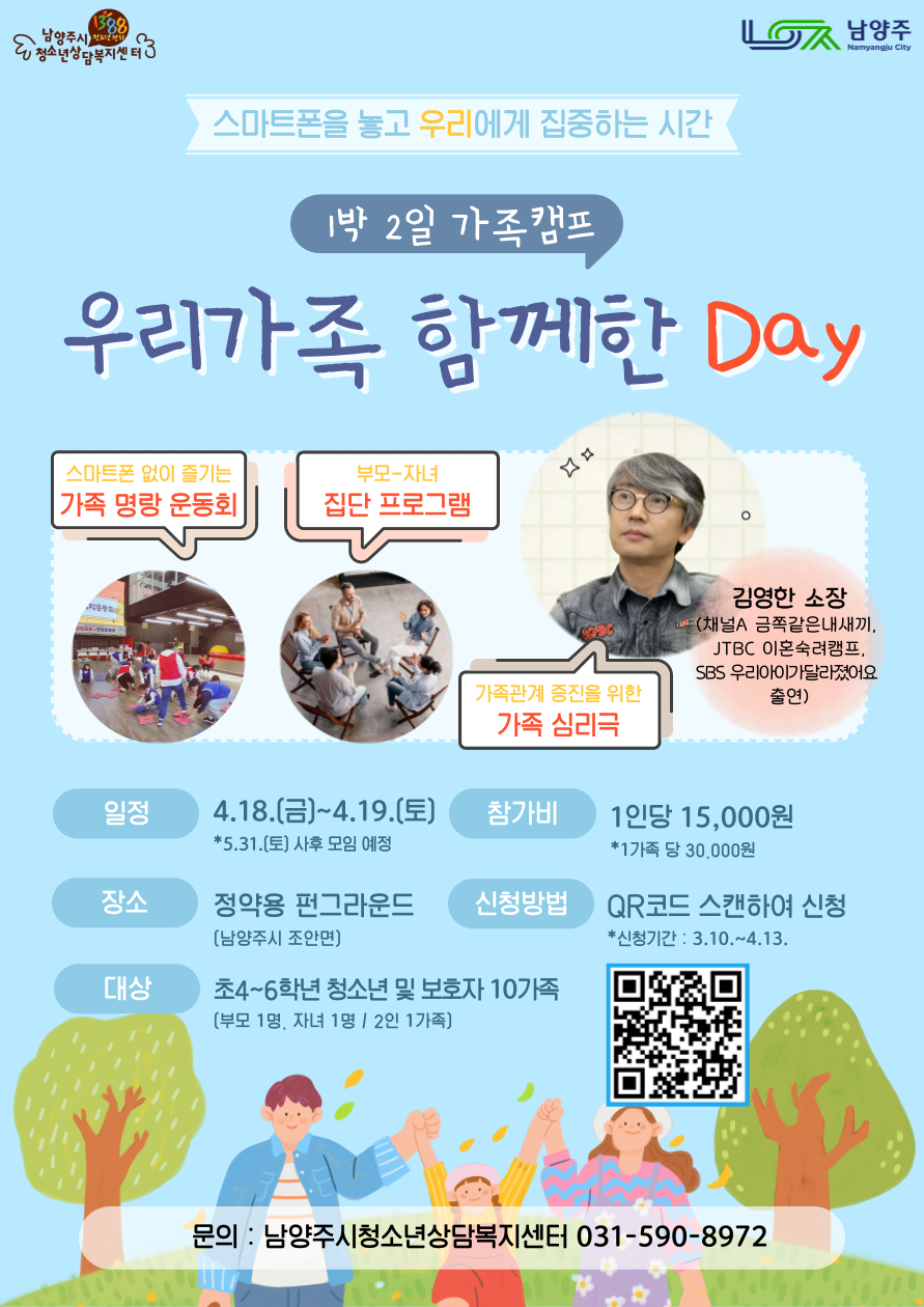 2025년 1박 2일 가족캠프 『우리 가족 함께한 Day』 신청 안내 작성자 청소년상담복지센터 등록일자 2025년 3월 10일 17시 7분 56초 조회 130 남양주시청소년상담복지센터에서는 인터넷, 스마트폰 과의존 문제를 예방하고 가족 간의 소통과 활동을 통해 건강한 여가 활동을 촉진하기 위한 2025년 1박 2일 가족 캠프 『우리 가족 함께한 Day』를 진행합니다. 관내 청소년 및 부모님들의 많은 관심과 신청 바랍니다.^^ 홍보포스터.png [ Size : 596.36KB, Down : 60 ] 미리보기 다운로드 목록보기
