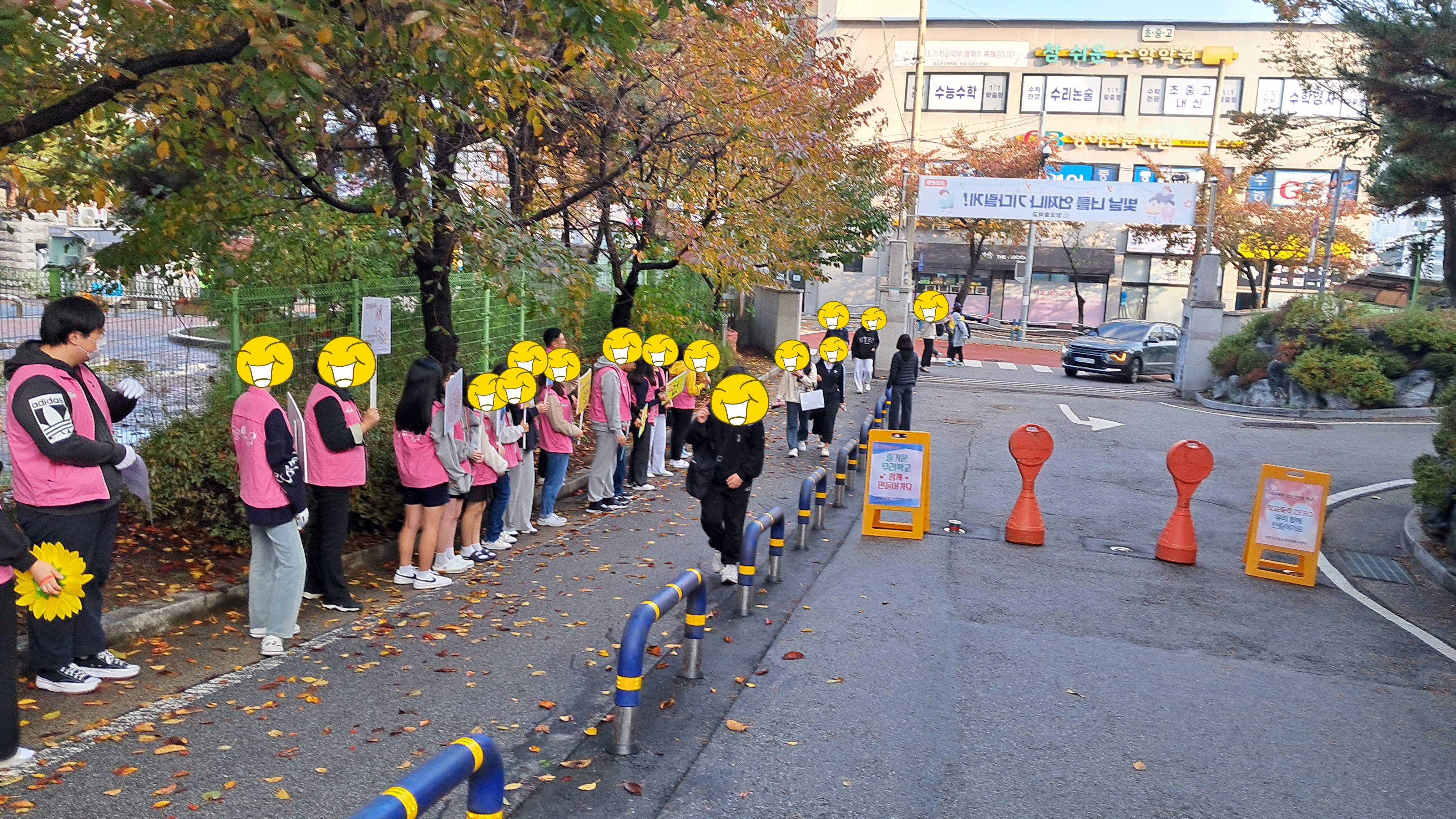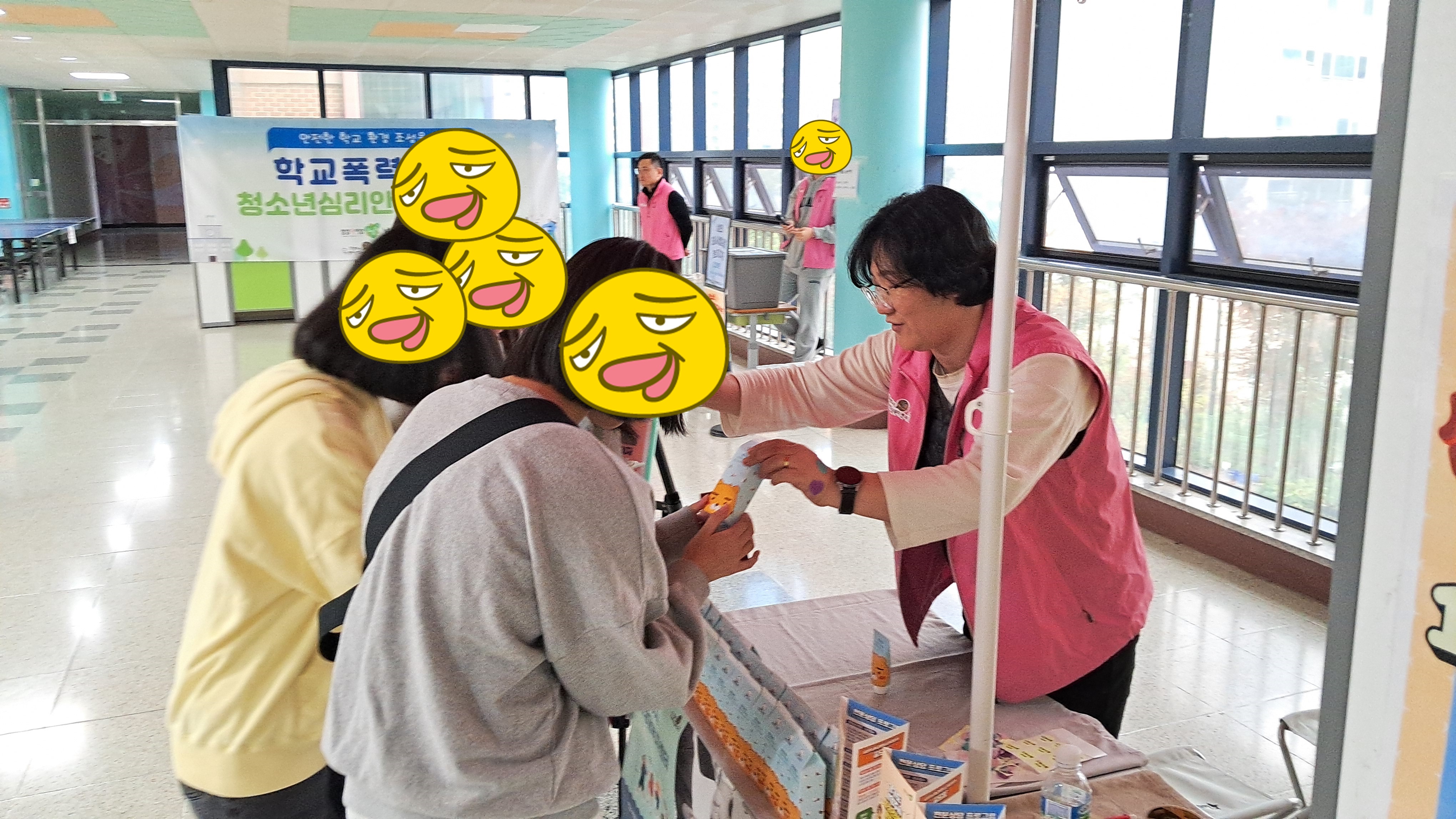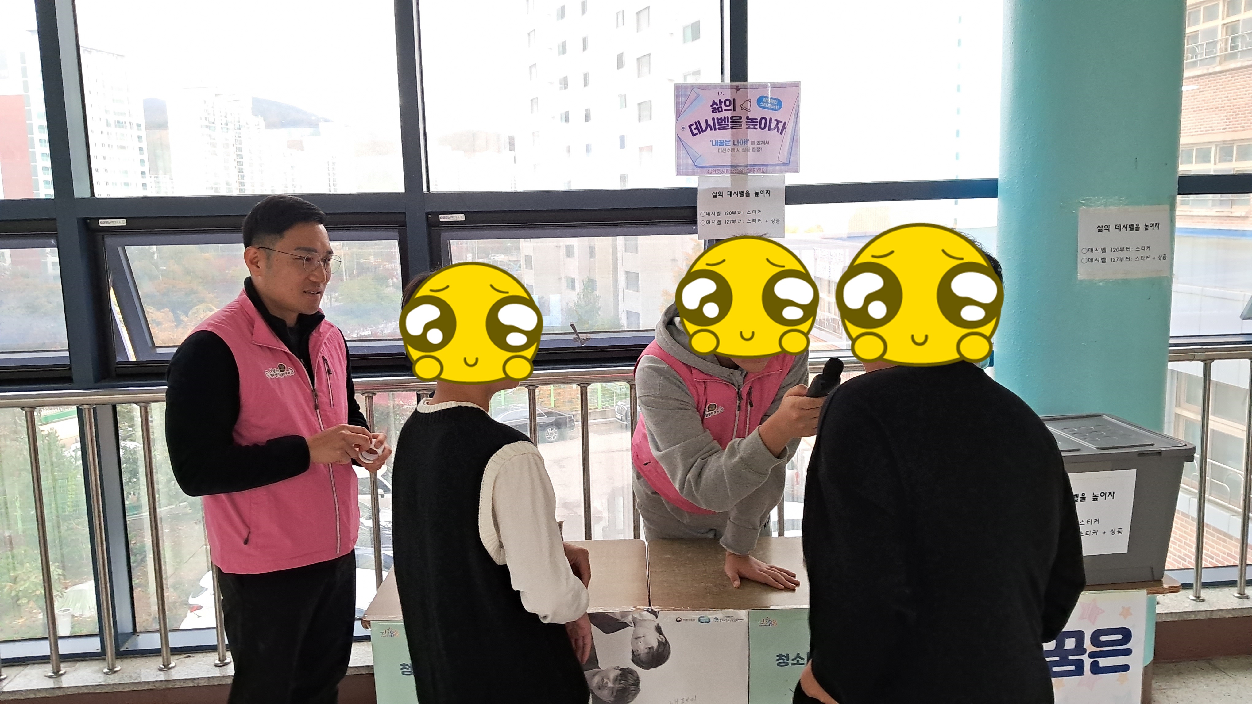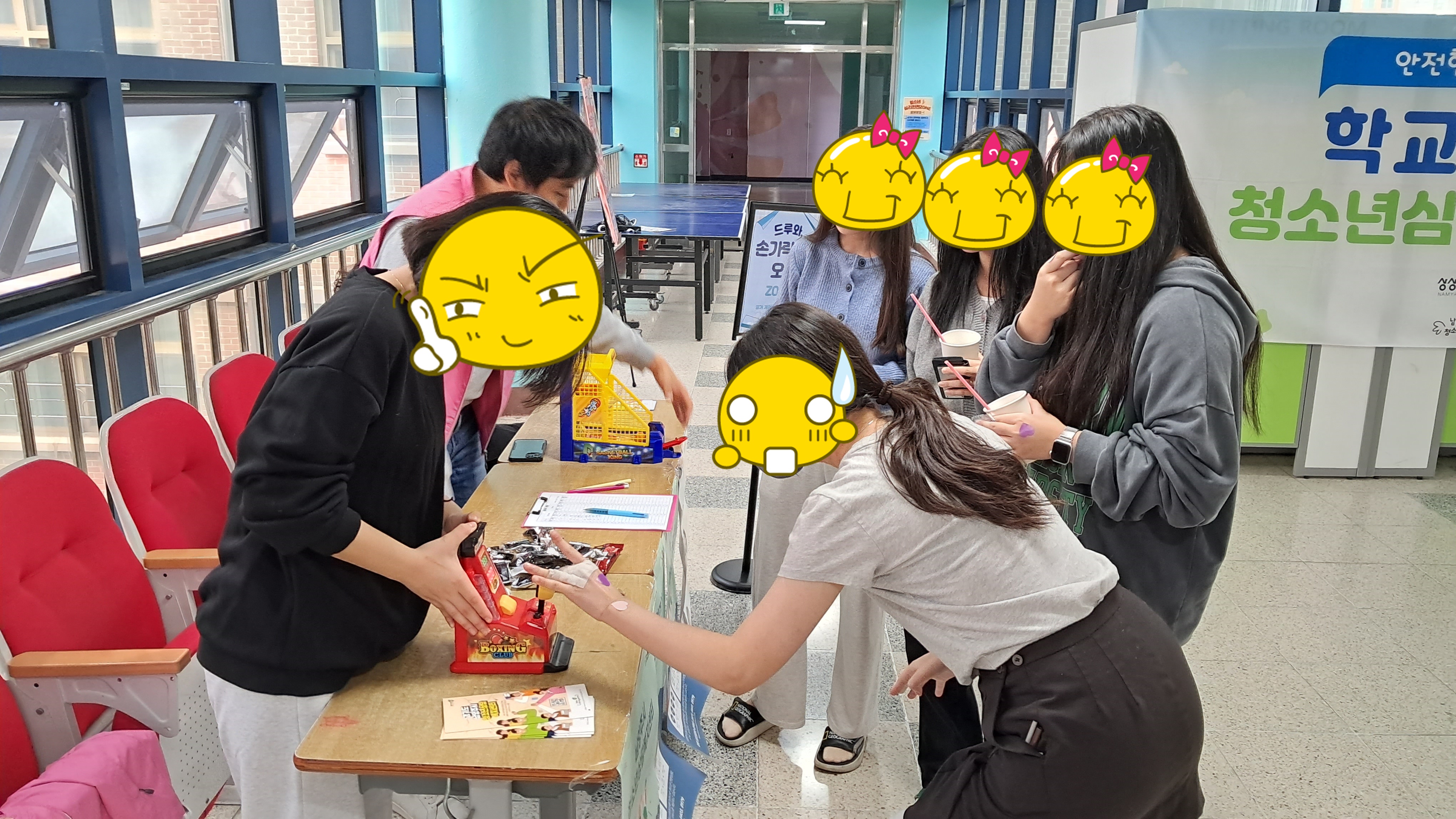 등교맞이 인사, 학교폭력예방 캠페인의 등굣길 행사가 이루어졌으며 3층 중앙통로에서는 스트레스 구기고버리고, 삶의 데시벨을 높이자, 드루와 손가락 오락실 등 3가지 부스를 참여한 학생들에게는 몸과 마음을 챙길 수 있는 힐링 간식꾸러미를 나누어주는 활동을 진행하였습니다.