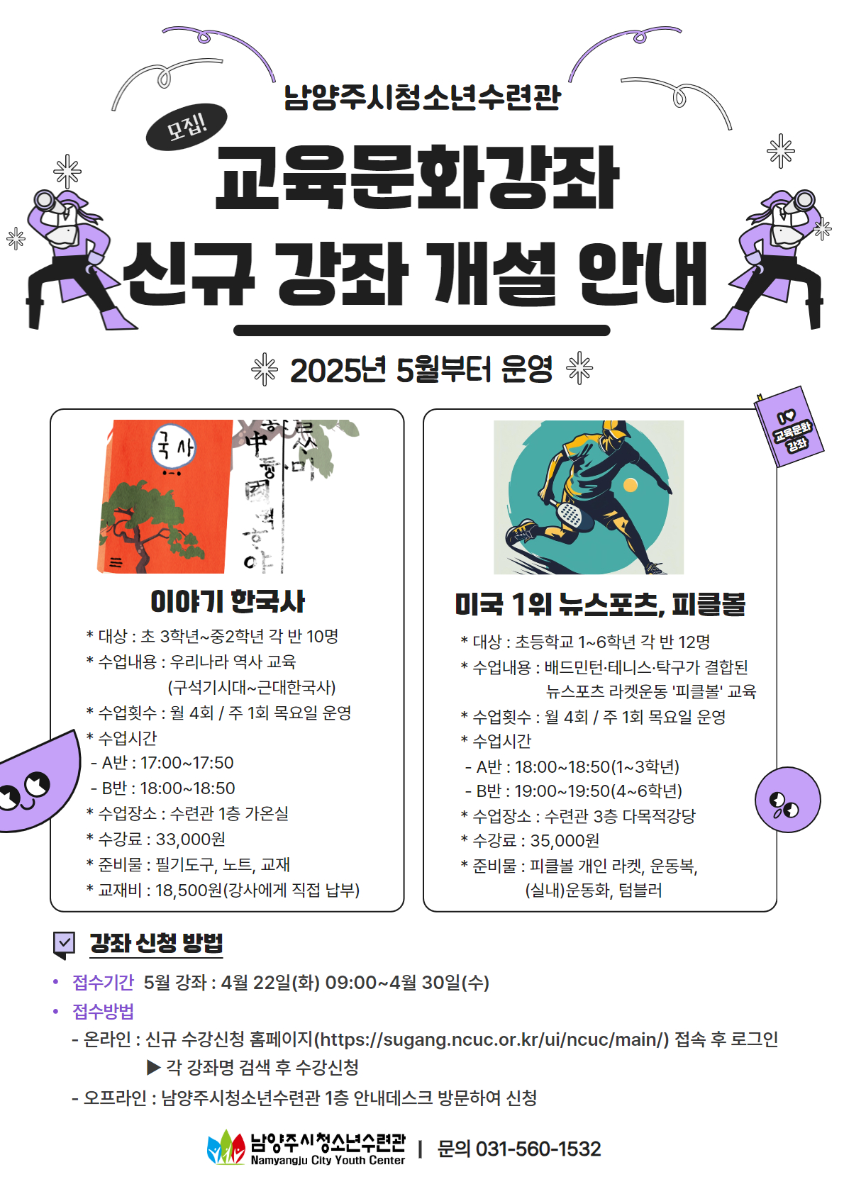 청소년수련관 2025년 남양주시청소년수련관 교육문화강좌 신규 강좌 개설 안내 작성자 청소년수련관 등록일자 2025년 4월 18일 17시 25분 57초 조회 415 안녕하세요, 남양주시청소년수련관입니다.5월부터 이야기 한국사, 미국 1위 뉴스포츠, 피클볼 강좌가 개설되어 운영합니다.자세한 내용은 아래의 홍보포스터를 참고부탁드리며, 수강회원님들의 많은 관심과 참여부탁드립니다. 감사합니다. 교육문화강좌 신규 강좌 개설 홍보포스터(최종).jpg [ Size : 985.82KB, Down : 292 ] 미리보기 다운로드 목록보기