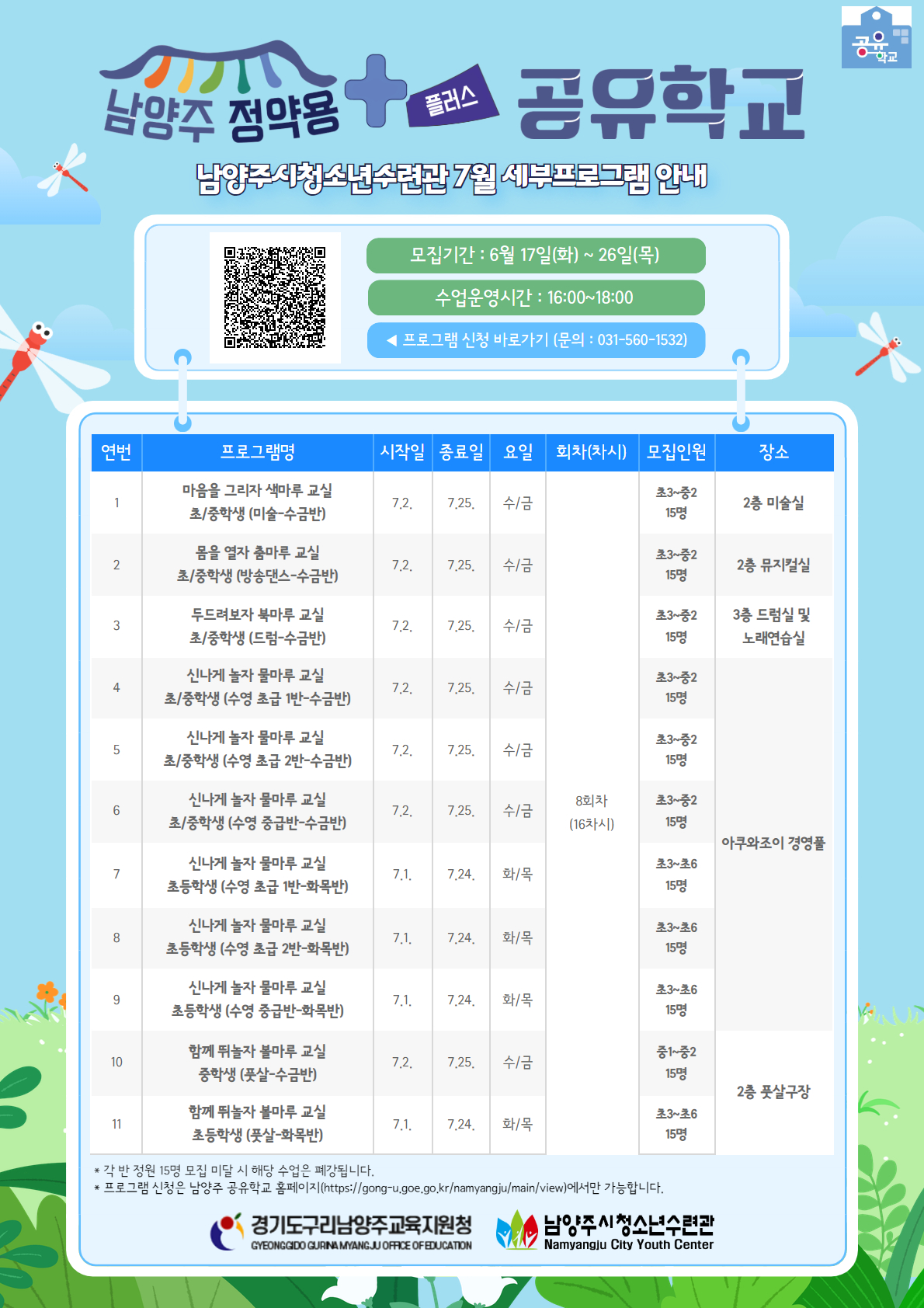 공지 청소년수련관 남양주 공유학교 7월 참가자 모집 안내
