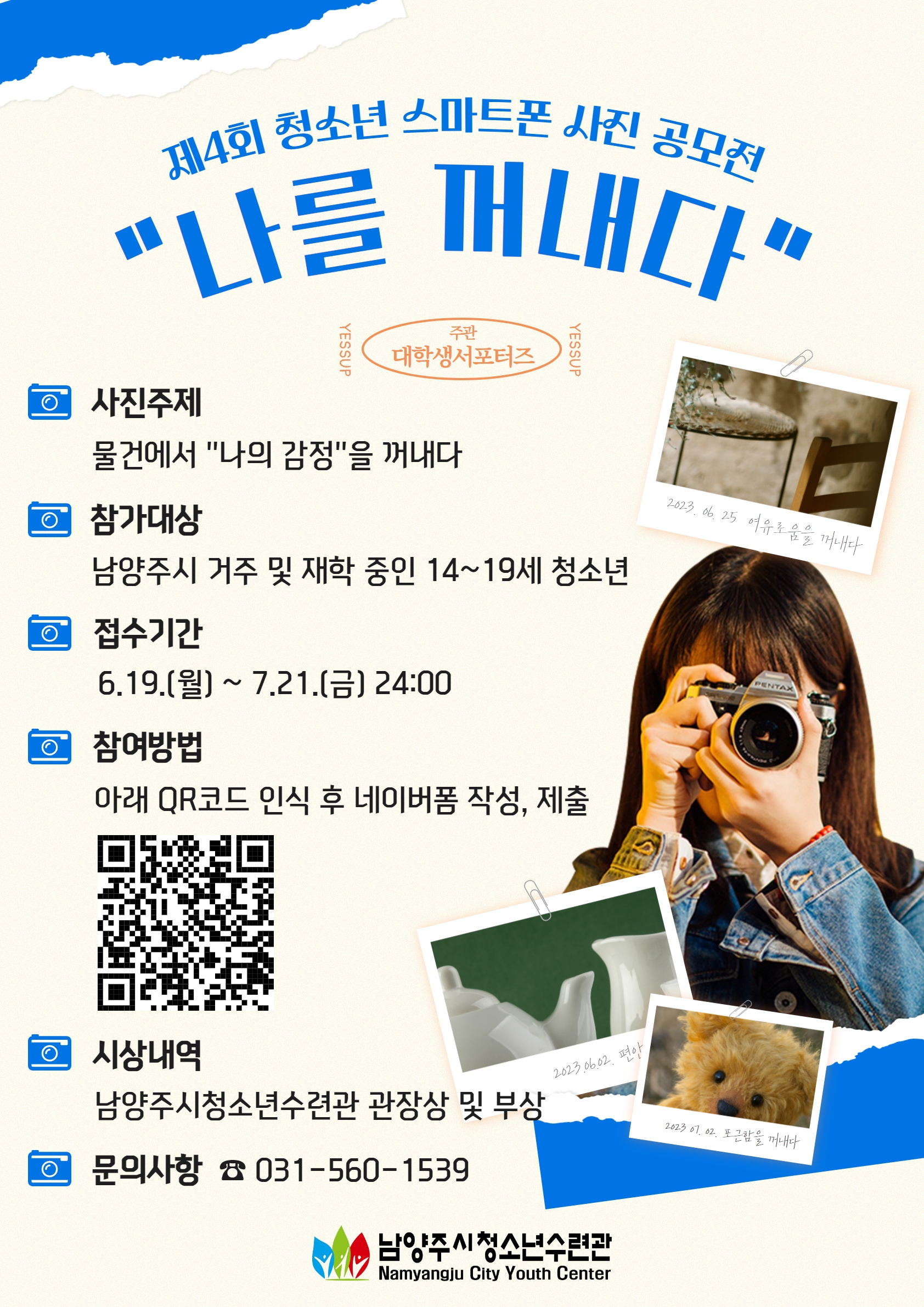 남양주시청소년수련관 대학생서포터즈[예썹]에서는 관내 청소년을 대상으로 스마트폰 사진 공모전을 개최합니다. <나를 꺼내다>라는 주제로 진행하는 4회 청소년 스마트폰 사진 공모전청소년 여러분의 많은 참여를 바랍니다.