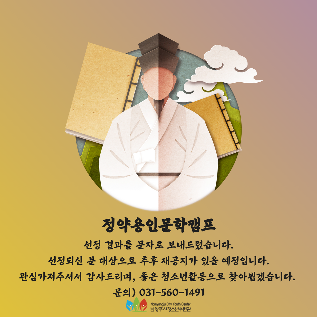청소년수련관 [청소년수련관] 정약용인문학캠프 선정결과 안내 작성자 청소년수련관 등록일자 2022년 11월 23일 19시 37분 31초 조회 542 정약용인문학캠프.png [ Size : 914.91KB, Down : 314 ] 미리보기 다운로드 목록보기