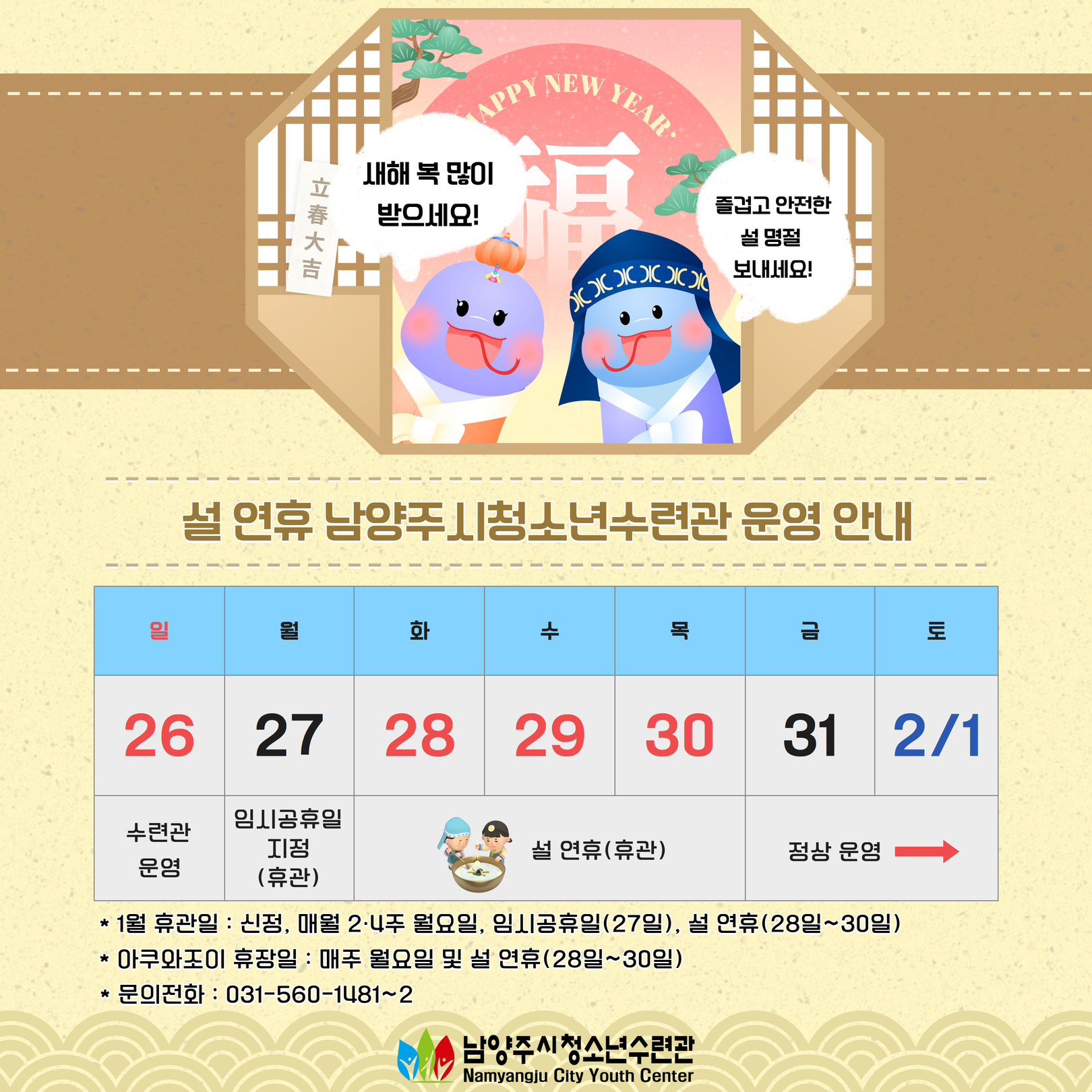 청소년수련관 2025년 남양주시청소년수련관 설 연휴 휴관 안내 작성자 청소년수련관 등록일자 2025년 1월 17일 15시 34분 58초 조회 270 (수련관) 설 연휴 휴관 안내.jpg [ Size : 1.83MB, Down : 125 ] 미리보기 다운로드 목록보기