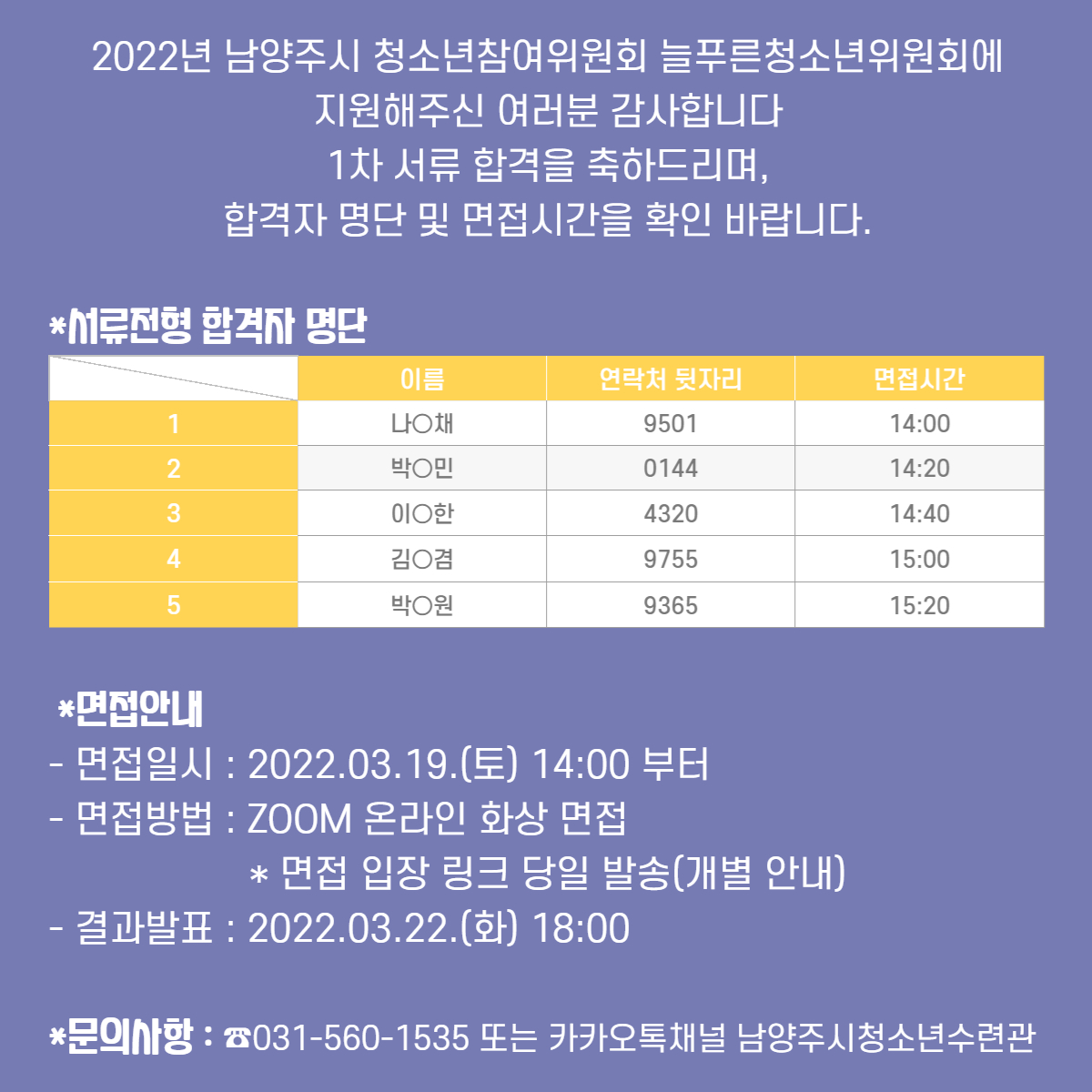 청소년수련관 [늘청] 남양주시청소년참여위원회 1차 서류전형 결과 및 면접 안내 작성자 청소년수련관 등록일자 2022년 3월 16일 0시 0분 0초 조회 426 늘청 서류합격자 및 면접 안내 002.jpg [ Size : 464.75KB, Down : 259 ] 미리보기 다운로드 목록보기